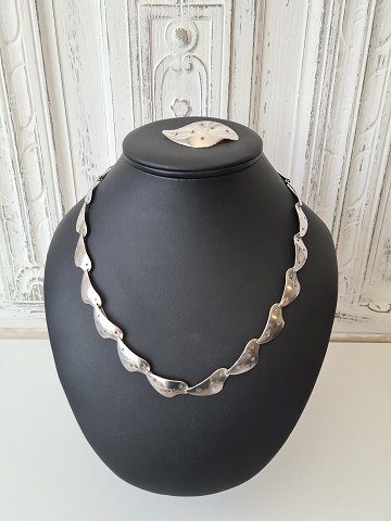 Jewelery set consisting of necklace, bracelet and brooch made of sterling silver adorned with stars in black enamel. |