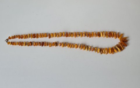 Lang vintage halskæde med pollerede ravstykker i forløb Længde 64 cm. Ravstykkerne variere i størrelse fra 7,6 mm. til 17,8 mm.
