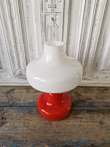 Holmegaard Oline petroleumslampe i rødt glas med hvis skærm i opalglas