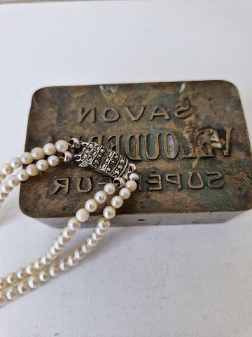 Two-strand pearl necklace with clasp in silver adorned with marcasites Length 37.5 cm. Measurements on the clasp 8 x 15 mm. Stamped Silver