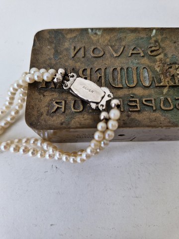 Two-strand pearl necklace with clasp in silver adorned with marcasites Length 37.5 cm. Measurements on the clasp 8 x 15 mm. Stamped Silver