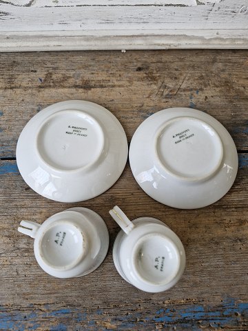 Par små franske café brûlot kopper i kraftigt jern porcelæn dekoreret med sort og guld fra A.Pillivuyt