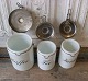 Gamle kaffe - te - kakao dåser i mælkeglas Mål: Kaffe: Højde 15cm. Diameter 11cm. Te - kakao: Højde 13cm. Diameter 8,5cm.