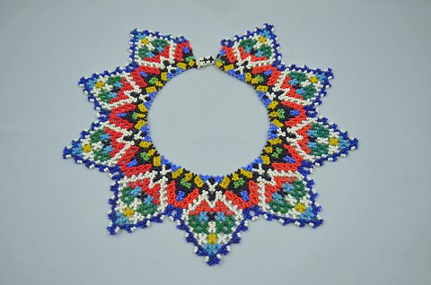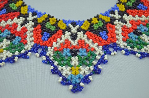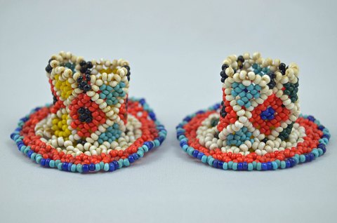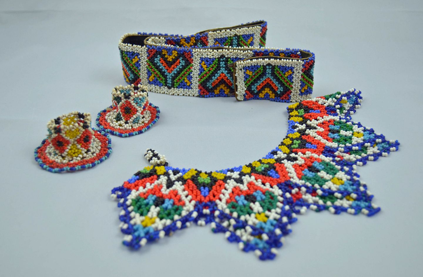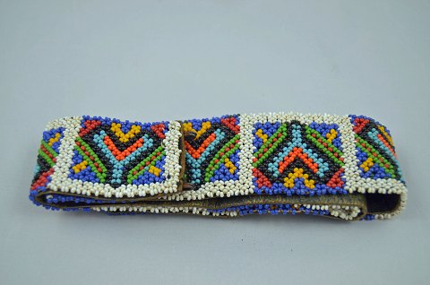 Smukt forarbejdet brudesæt fra Grønland, der består af tre dele. Et flot perlebroderet bælte med en bagside af sælskind. En perlebroderet halskæde og to lysestager/lyseholdere. Alle dele er fremstillet af grønlandske perler. Pris: 750 kr. for sættet. Varenr.: 204187