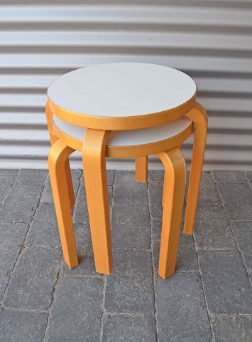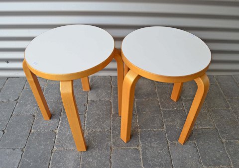 To styk Alvar Aalto skamler. Skamlerne er udformet i bøg med hvid laminat top. Skamlerne er velholdte. Højde: 44 cm. Ø: 41 cm. Pris pr. stk. 800 kr.