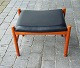 Skammel med stel af teaktræ med polstret sæde i sort nappa. Skamlen er fra H.F. Spøttrup, Denmark. Skamlen er i pæn stand med enkelte rifter på den ene ben.
