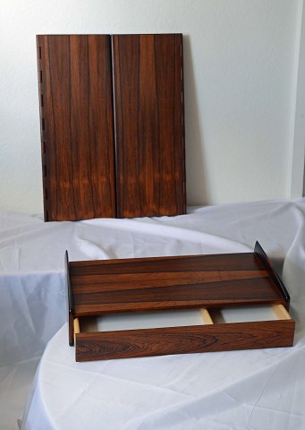Spejlsæt med hylde med skuffe og sammenklappelig spejl i Palisander designet af Melvin Mikkelsen. Sættet er stemplet M M M. Sættet er i meget pæn stand.