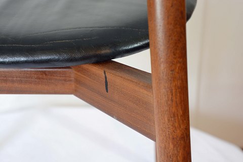 Spisebordsstol design Harry Østergaard. Produceret af Randers Møbelfabrik. Stel i teak med læderbetrukket sæde. Sædet fremstår med brugspatina. Pæn stand.