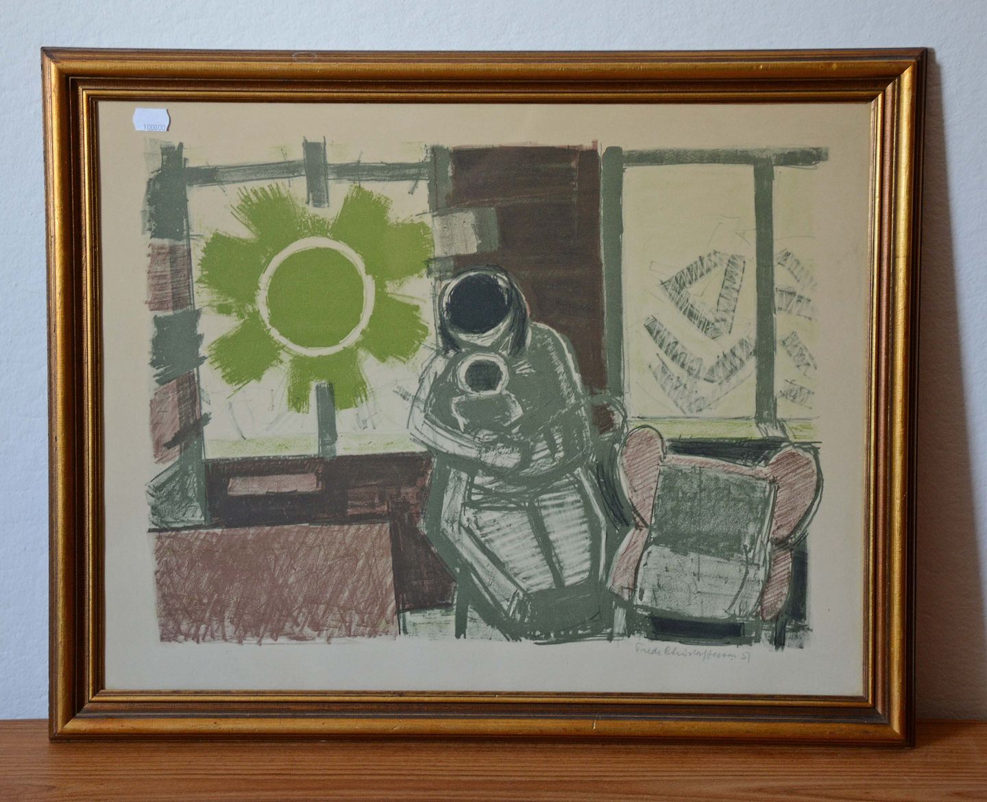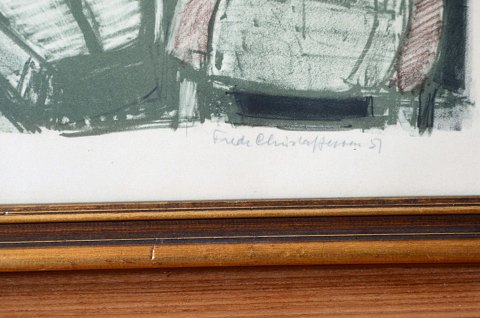 Litografi af Frede Christoffersen, 1957 med motiv af kvinde med barn i stuemiljø.