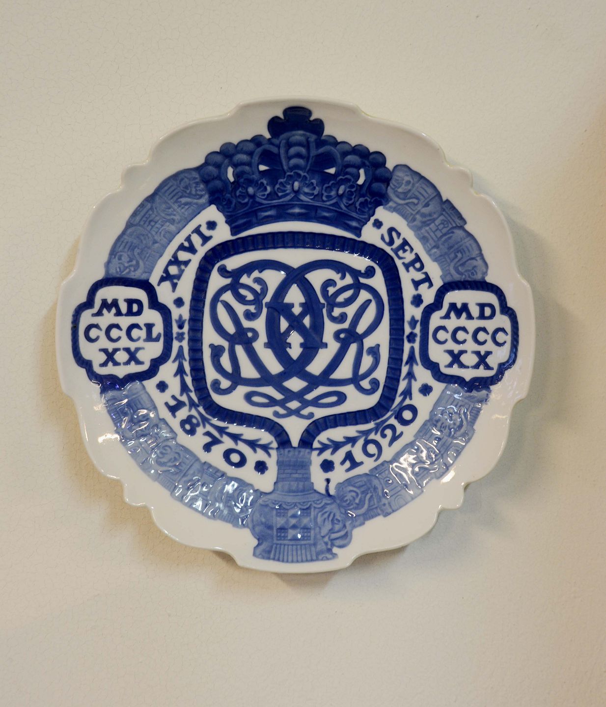Kongelig 50 års platte for Kong Christian den tiende 1870-1920 (nr. 23) fra Bing og Grøndahl. Intakt. 1. sort.