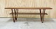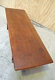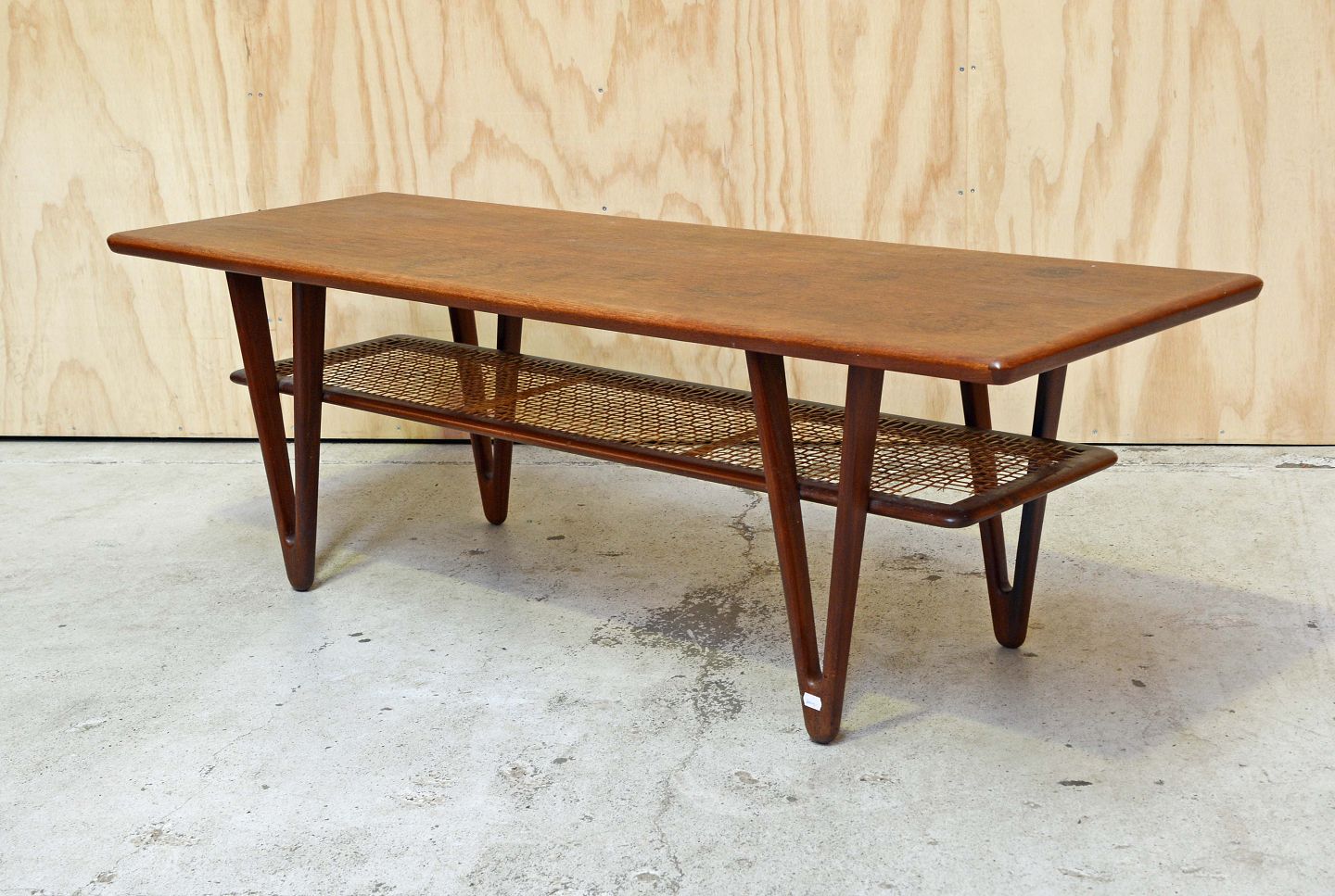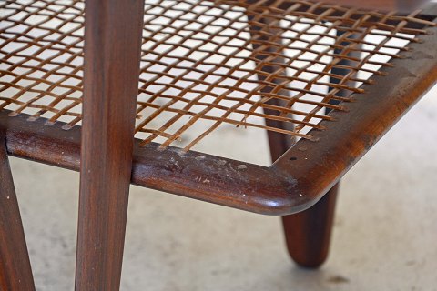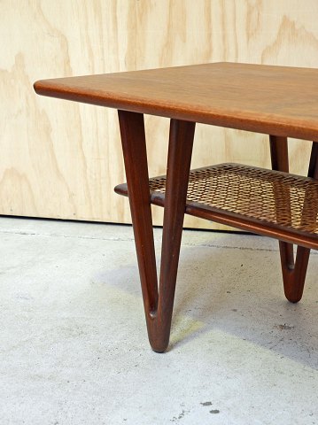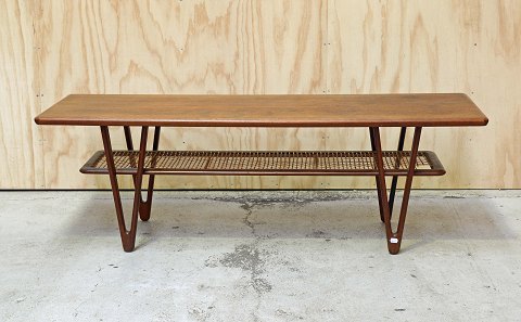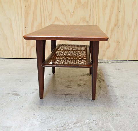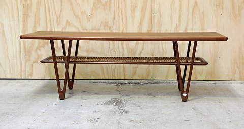 Sofabord i teaktræ med hylde i bambusflet og trekantet ben. Fremstår med et manglende bambusflet i et mindre område og brugsspor på toppladen.