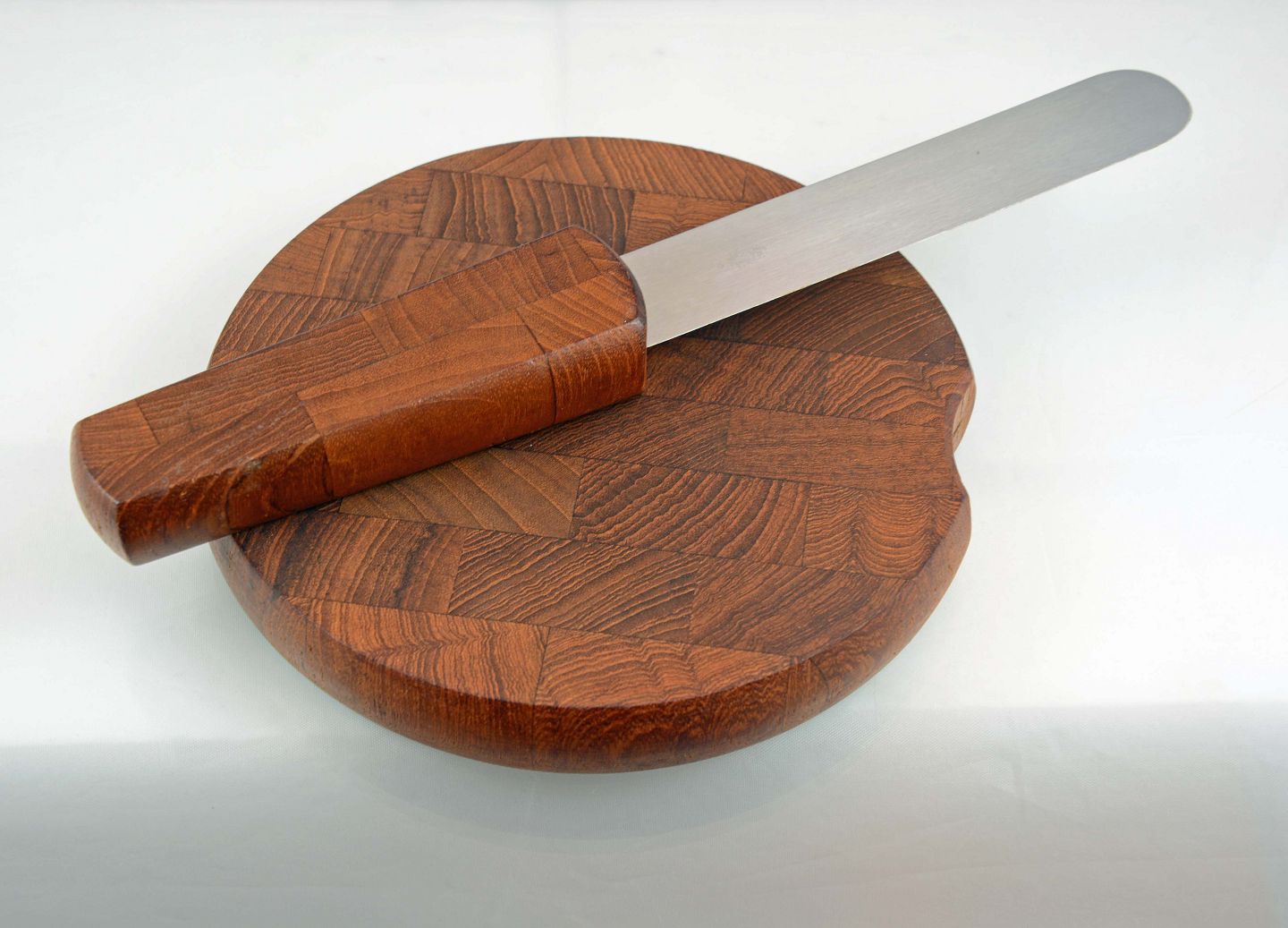 Rundt ostebræt i teaktræ med kniv fra Jens Harald Quistgaard. Stemplet JHQ. Intakt med overfladiske brugsspor. Det er den lille udgave, ses ret sjældent.