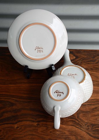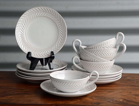Keramik stel model Alma. Sæt med 5 tekopper, 5 underkopper og 5 kagetallerkner samt et lågfad.