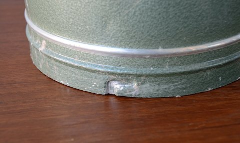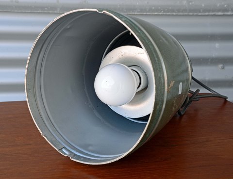 Loftslampe med skriften Magnifax er med skærm i grågrøn metal og porcelænsfatning. Loftslampen er fremstillet af et gammelt foto forstørrelsesapparat. Fremstår med brugsspor.