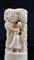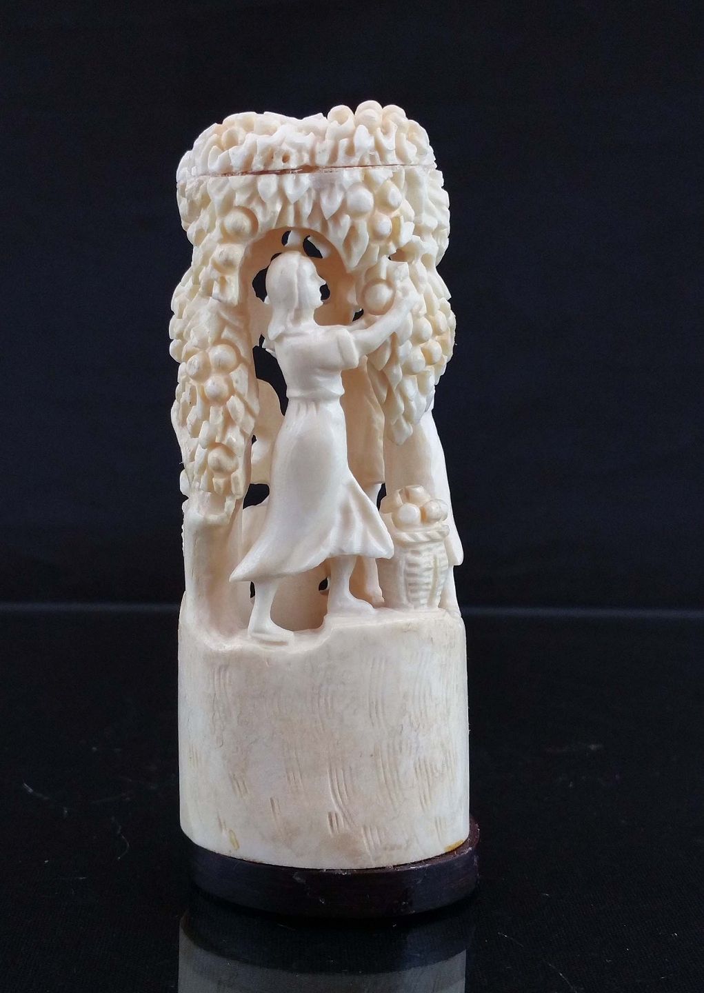 Grønlandica figur udskåret i ben med motiv af kvinder, som plukker frugt. Fejl på figuren - et stykke er limet på.