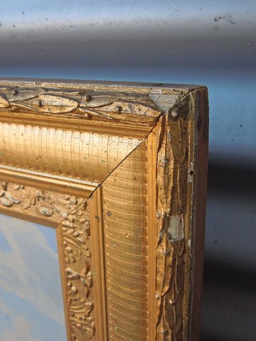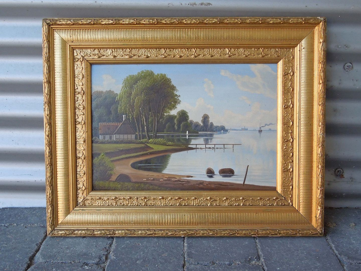 Olie på træplade. Maleri med naturtro landskabsmotiv. Usigneret. Fremstår med afslag på rammen.