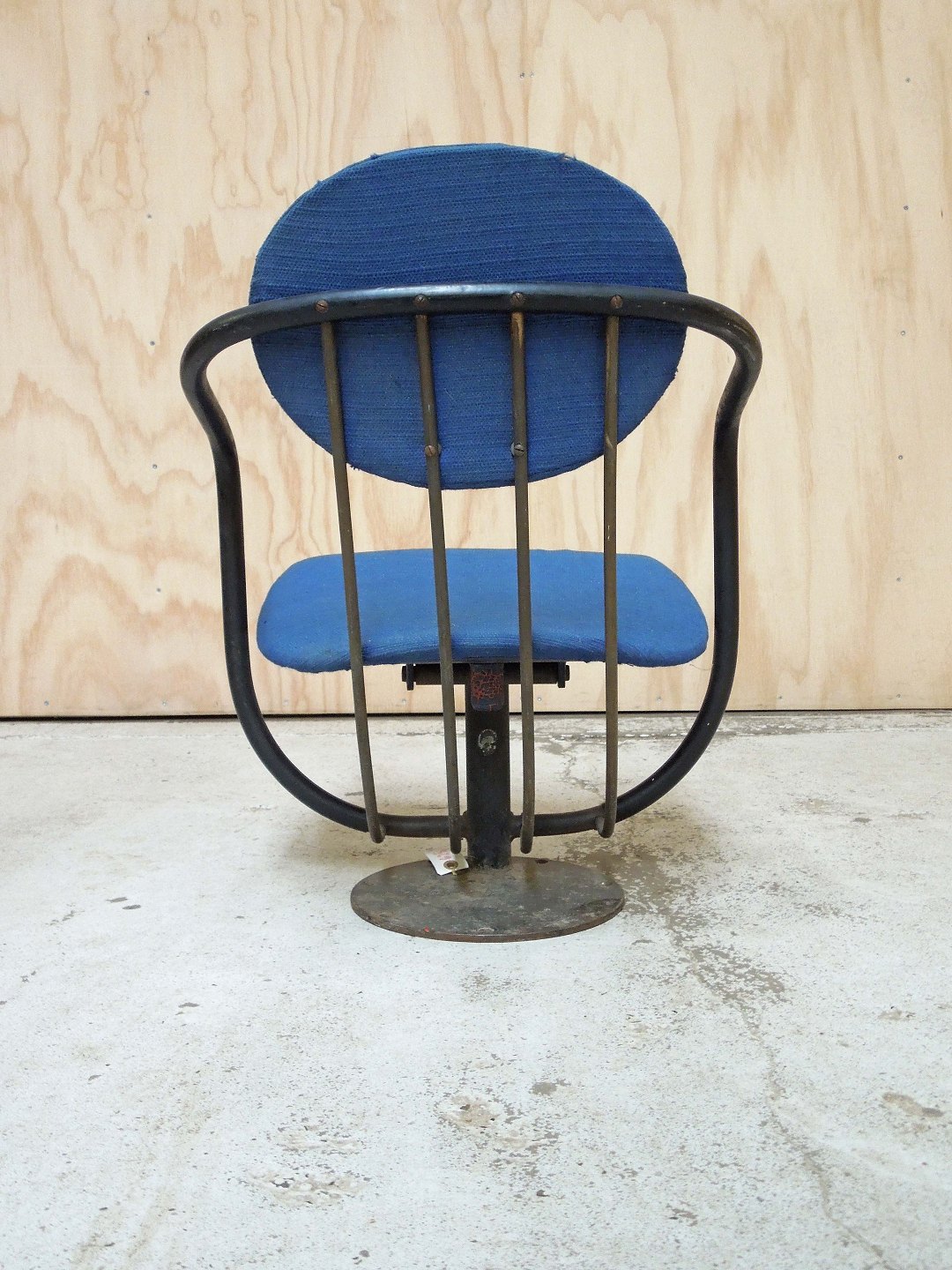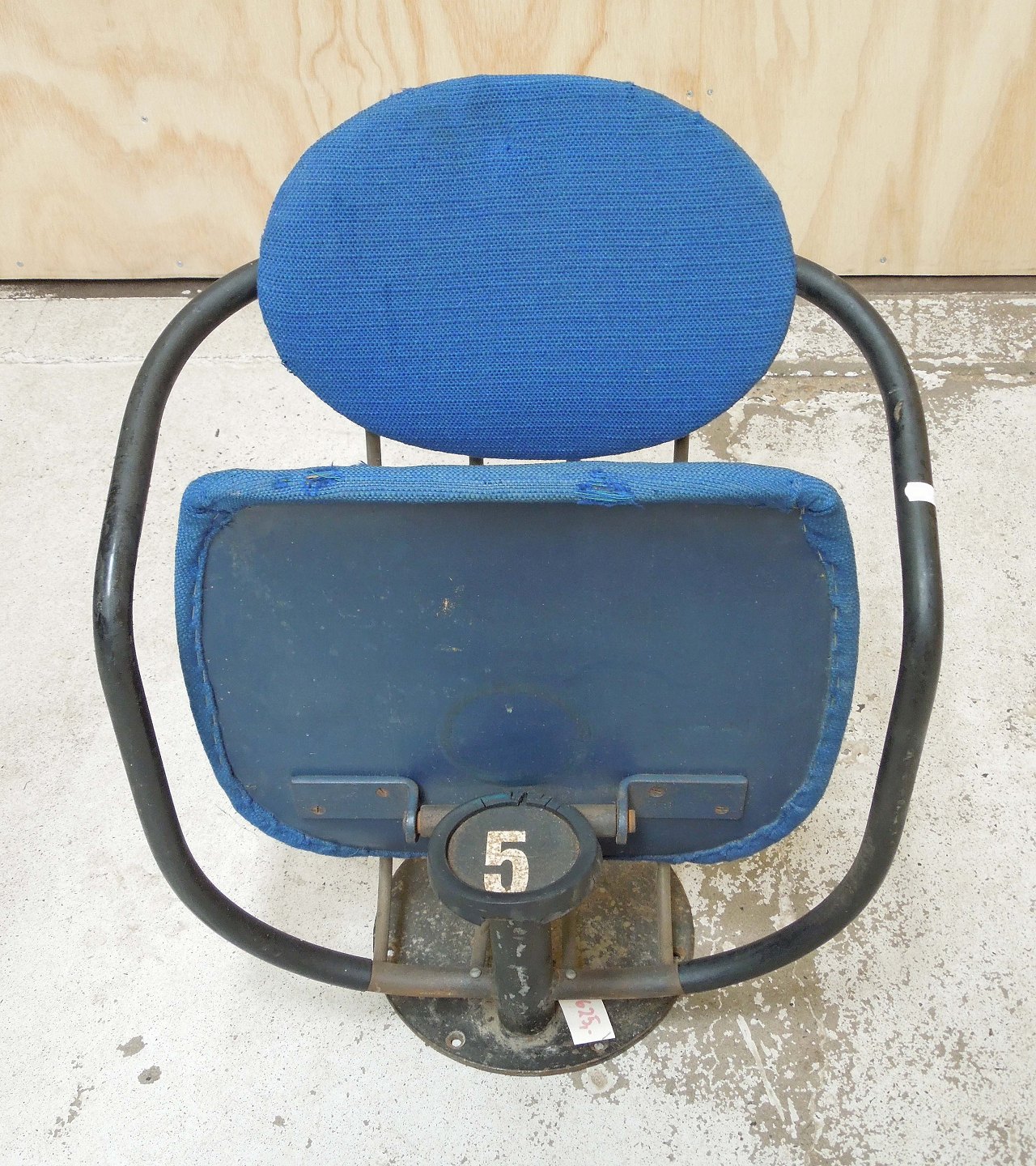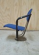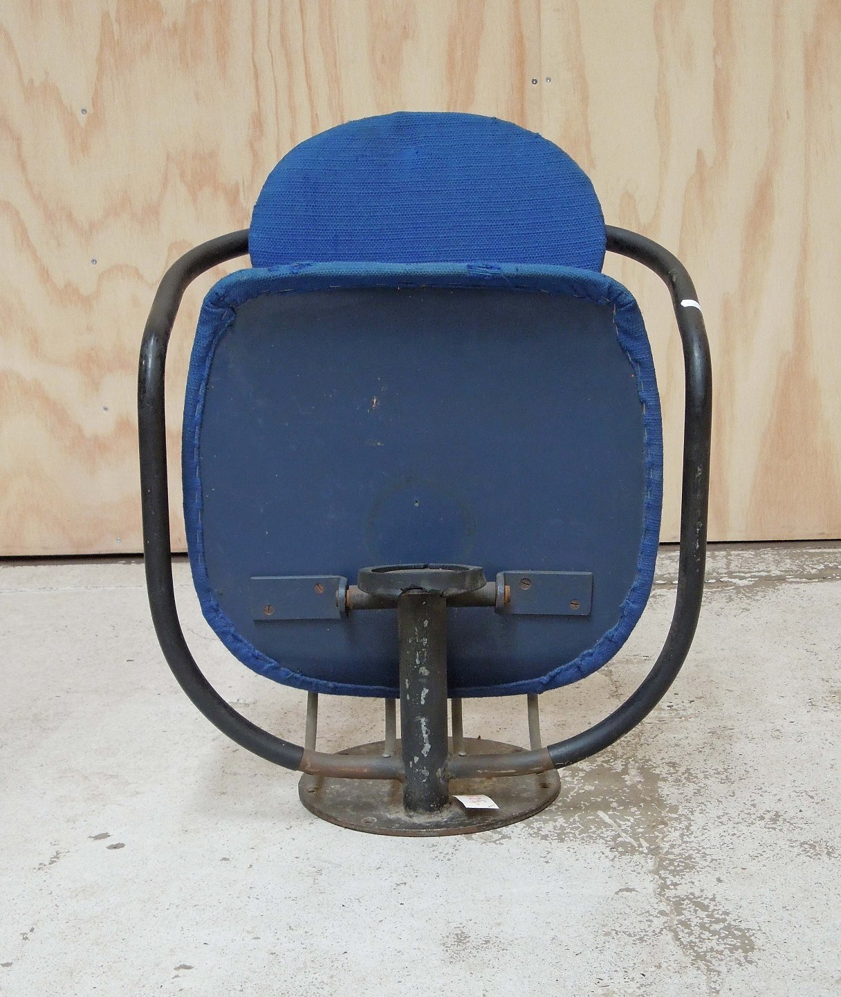 Biografstol med sort metal stel og blå betræk. Skader på polstring.