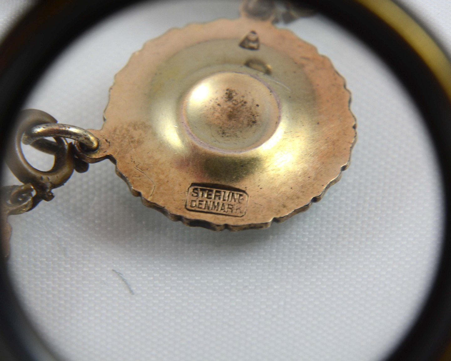 Stemplet Sterling, Denmark. Forgyldt sølv med hvid emalje.