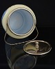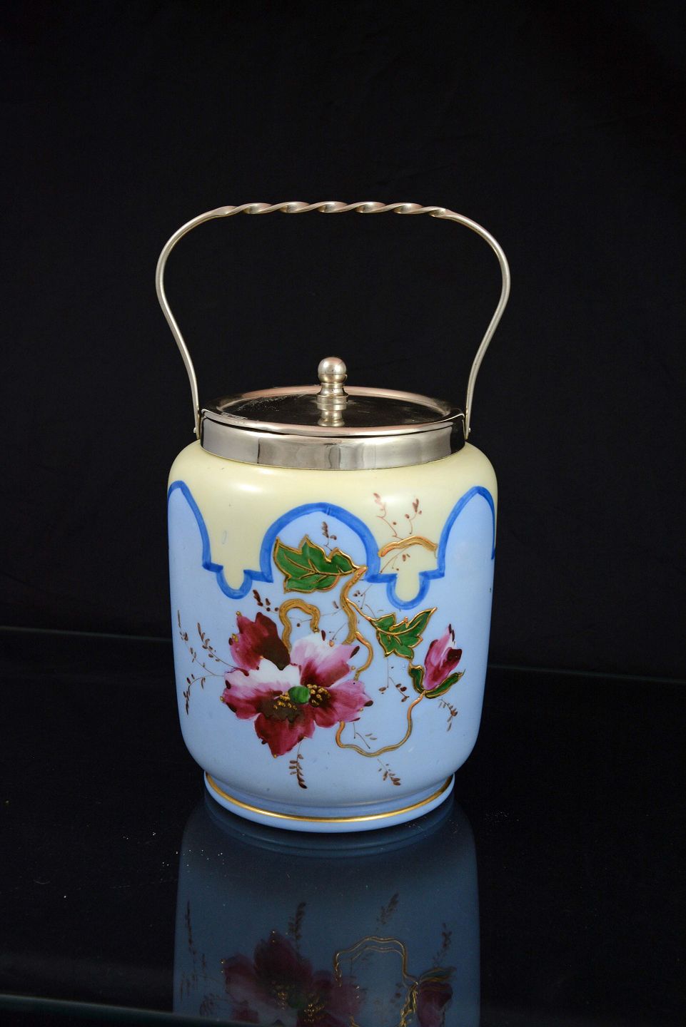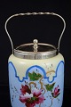 Blå/råhvid glas kagekrukke med blomster. Låget er fremstillet i sølvbelagt metal.