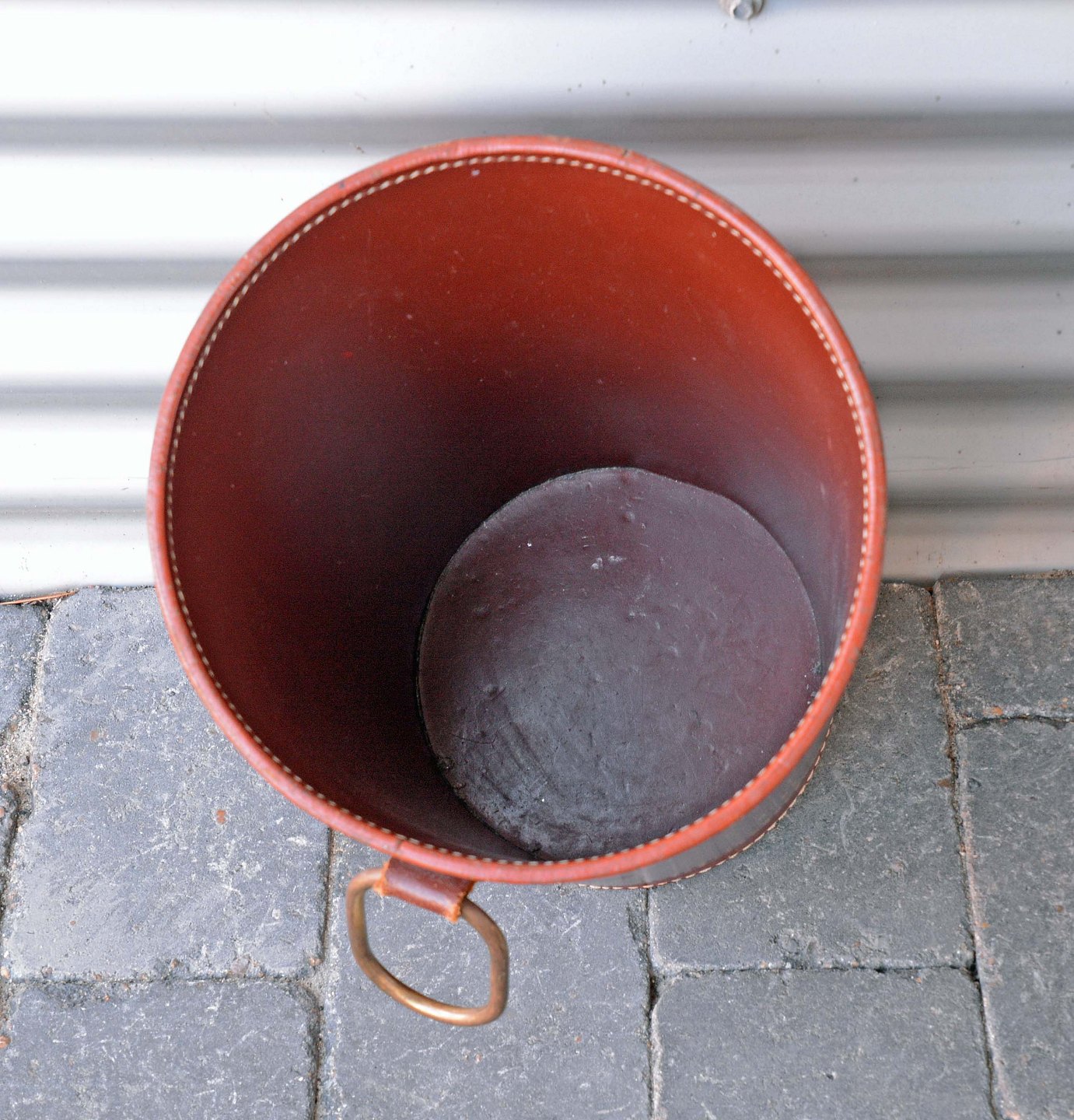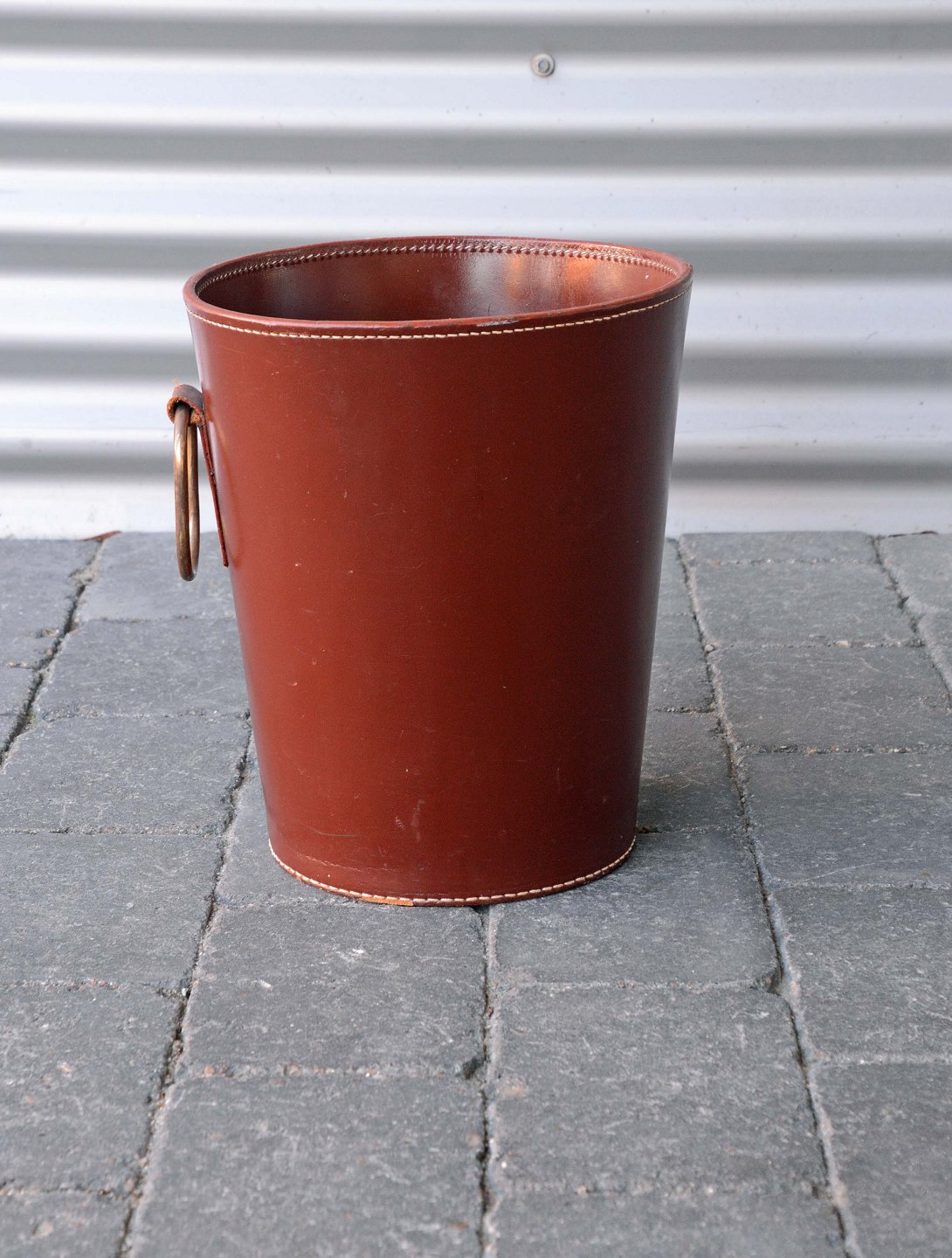 Papirkurv designet af Carl Auböck. Kurven er fremstillet af kernelæder i farven mørk cognac/rødlig brun med greb af messing. Papirkurven har intakte syninger og fremstår med brugsspor.