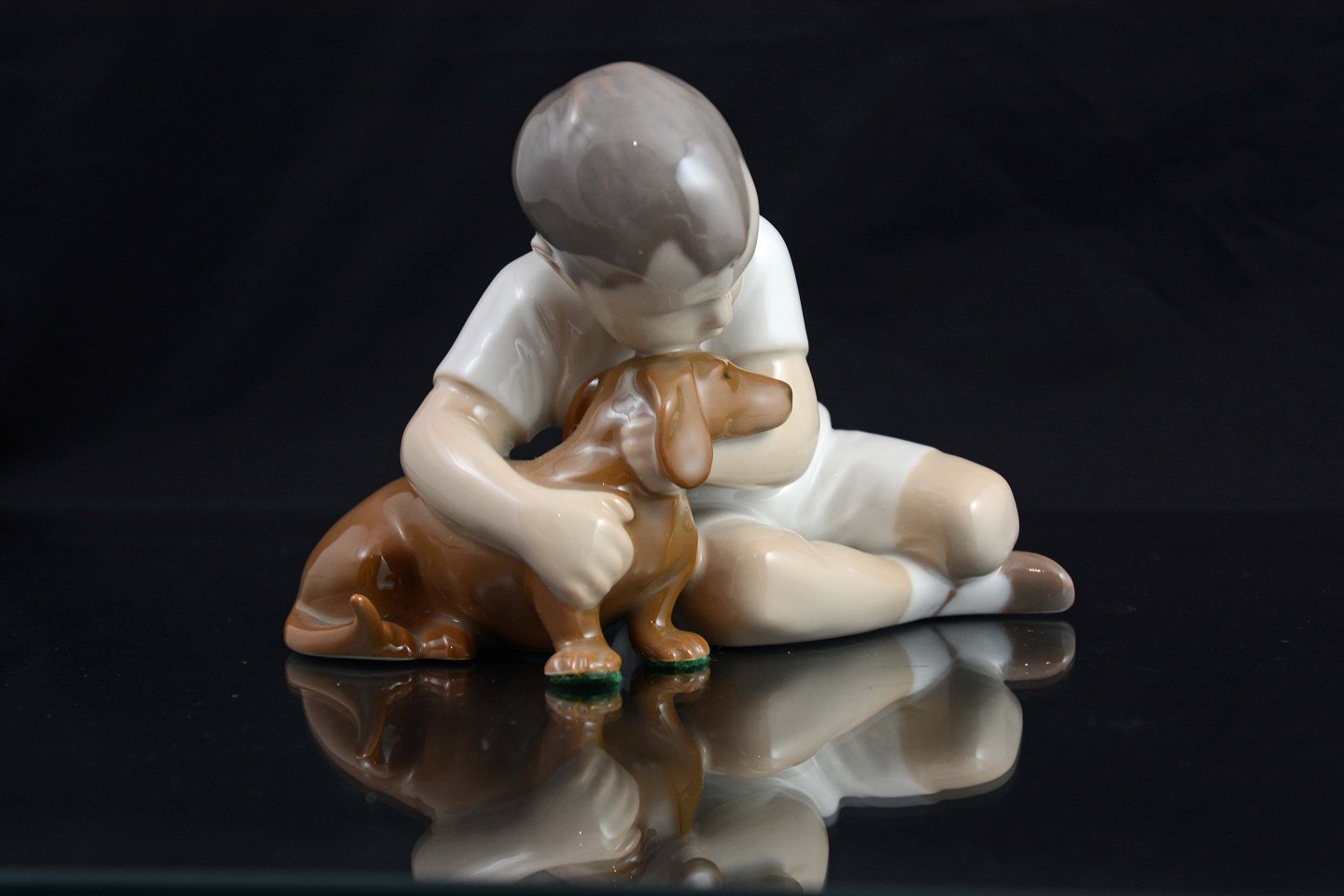 B&G Porcelæns figur: 'Dreng med hund' (nr. 1951) designet af Ingeborg Plockross Irminger for Bing og Grøndahl. Drengen har hvid skjorte.