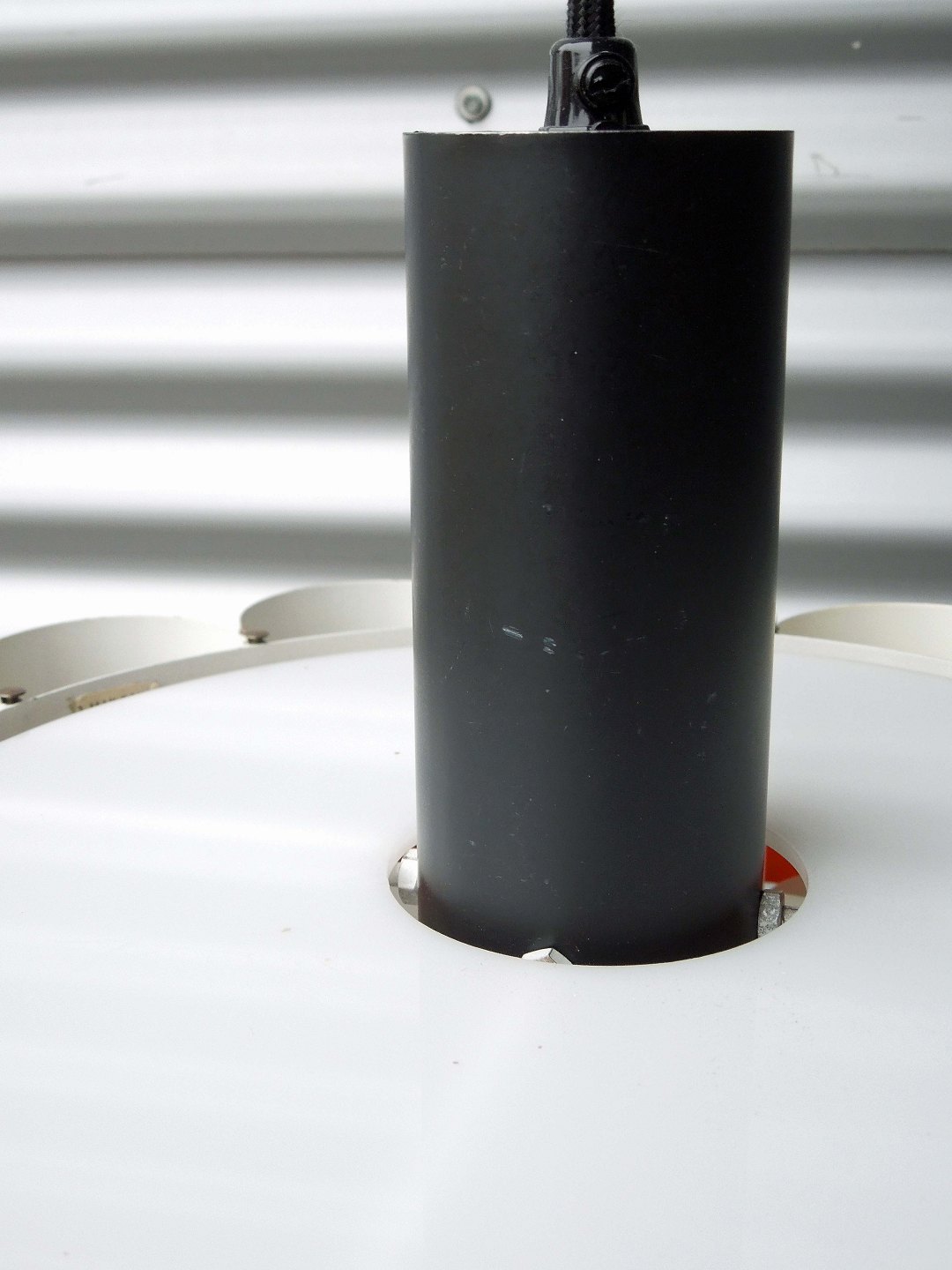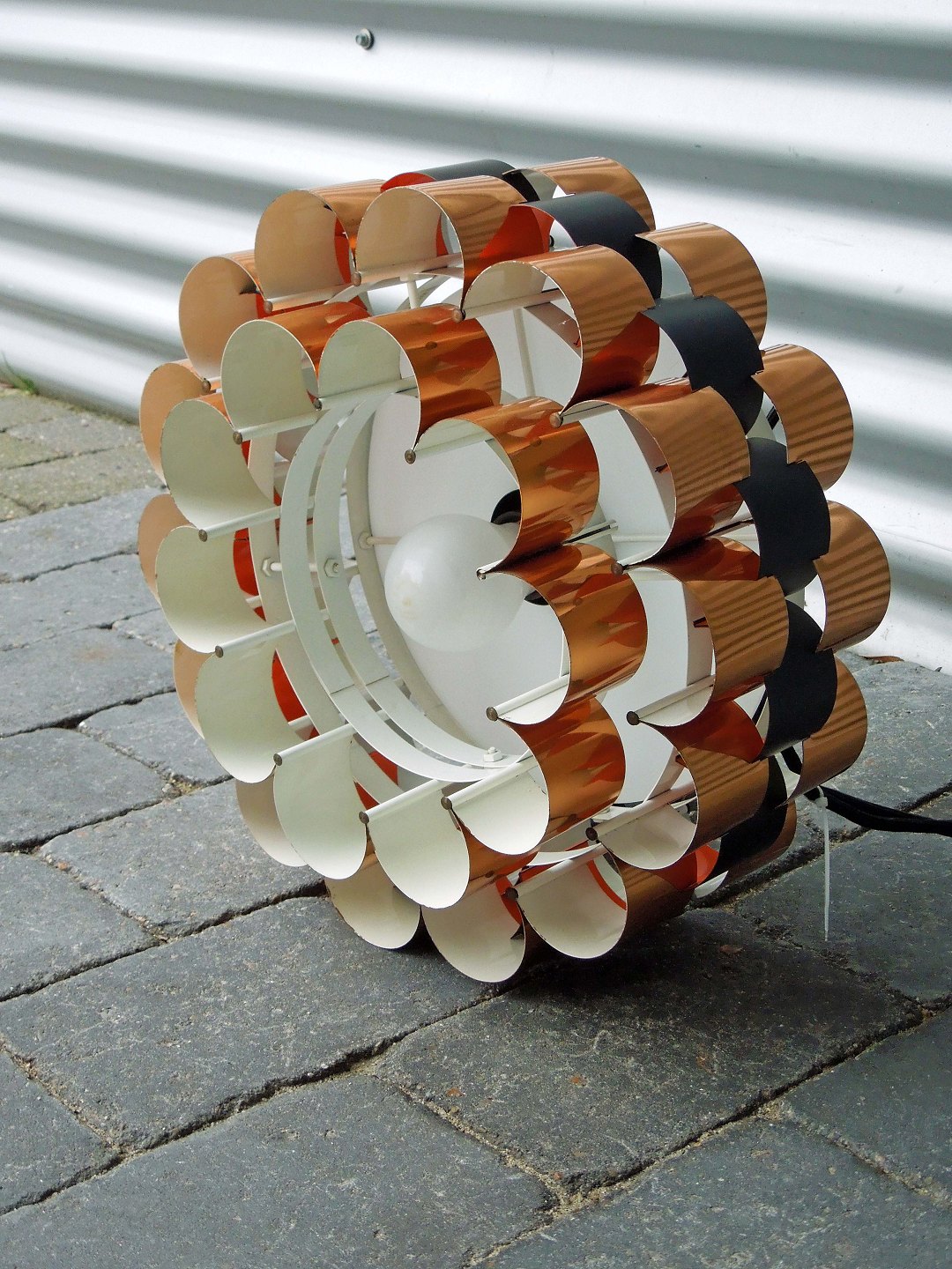 Loftslampe udformet af kobber og sortlakeret metal. Fra Verner Schou.