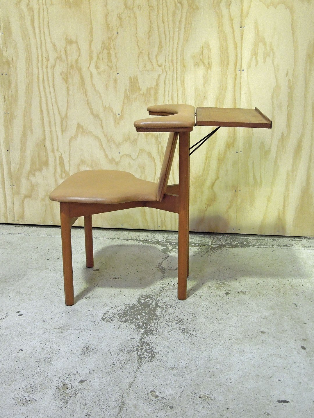 Frederik den syvende stol designet af Hans Olsen. Stolens ryg og sæde er betrukket med beige læder. Bag på Frederik 7 stolen er der en mindre klap-op skriveplade. Stolens stel og skriveplade er fremstillet teak.