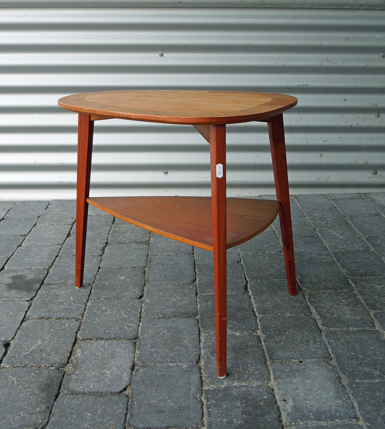 Lille ovalt sidebord med hylde. Bordet er i teaktræ og fremstår med lettere brugsspor.