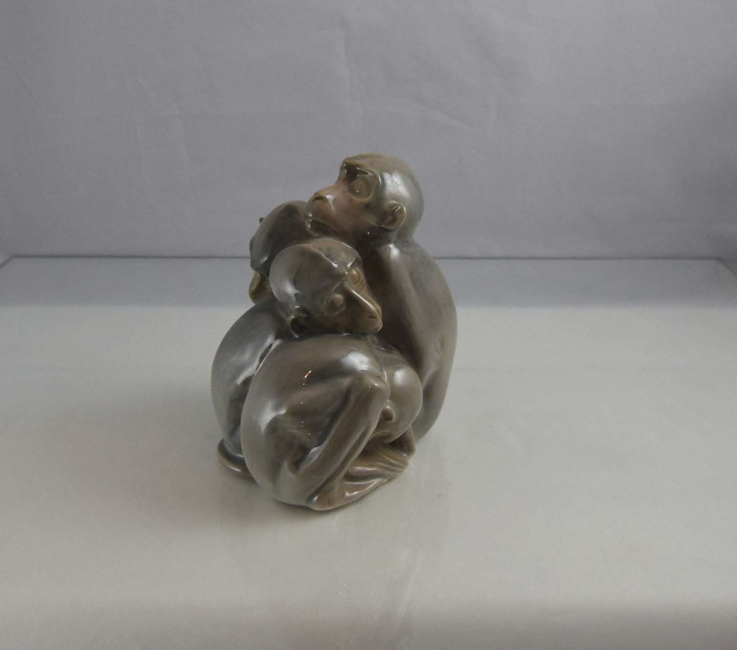 Familie af aber nr. 1581 designet af Ingeborg Plockross Irminger for Bing og Grøndahl. Vi har figuren i grålig farve og en med brun farve