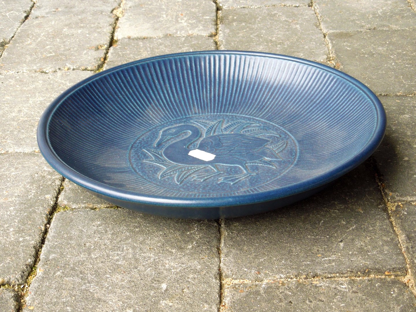 Blåt stentøjs fad med motiv af fugl. Kunster: Ipsens Enke.