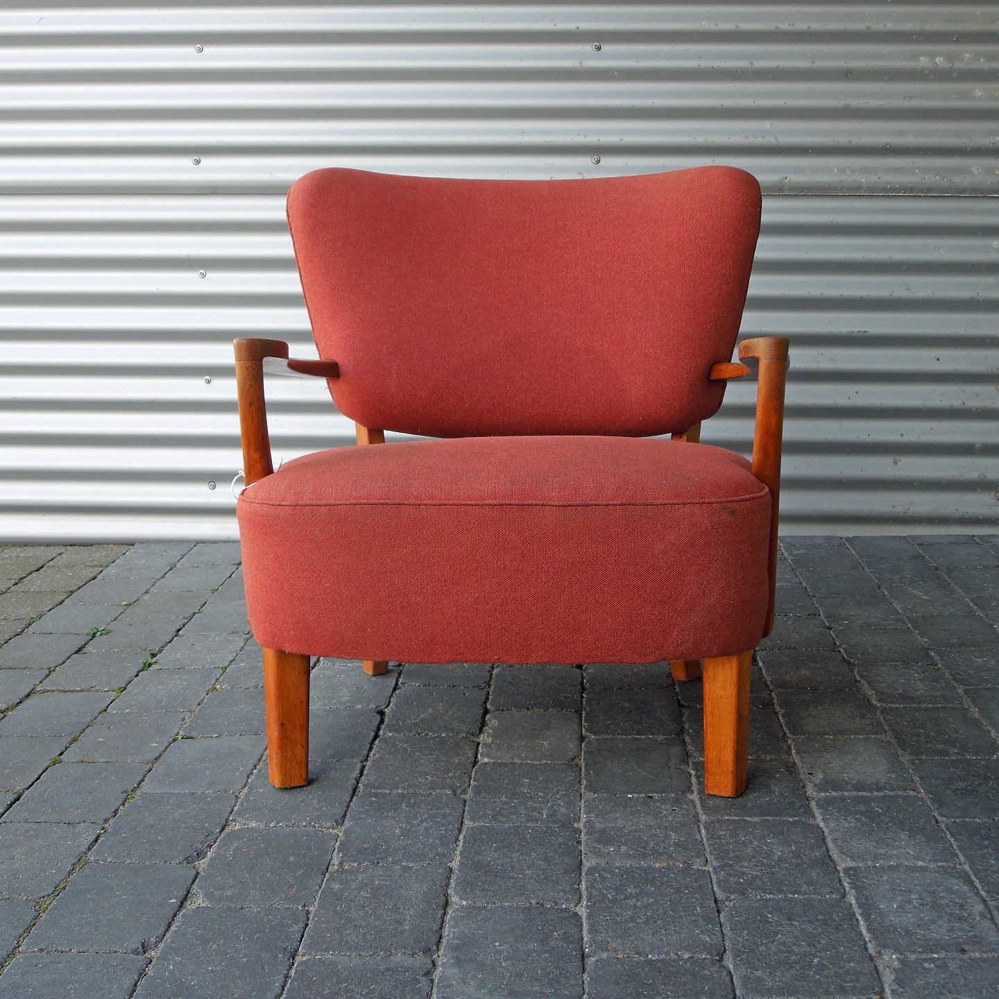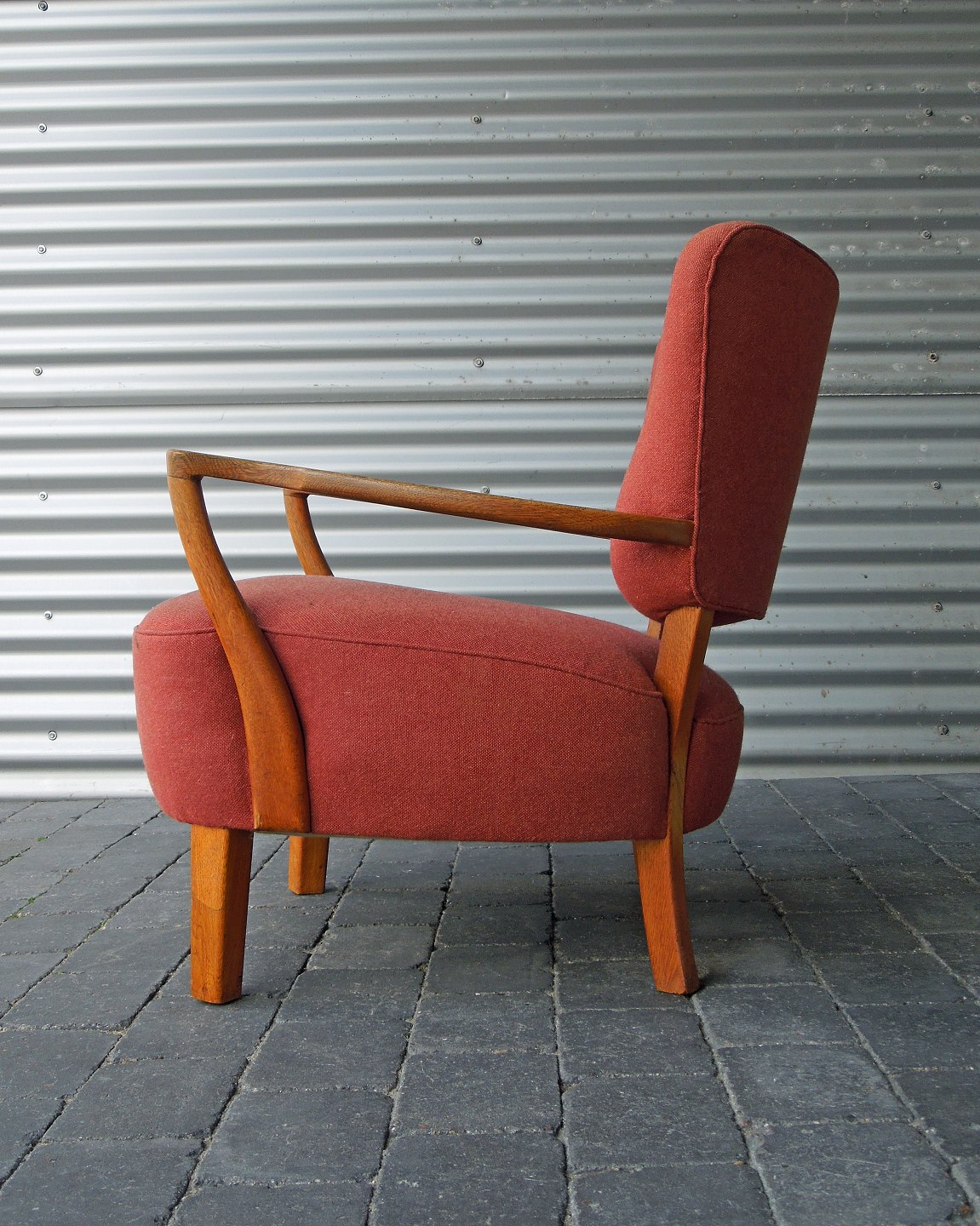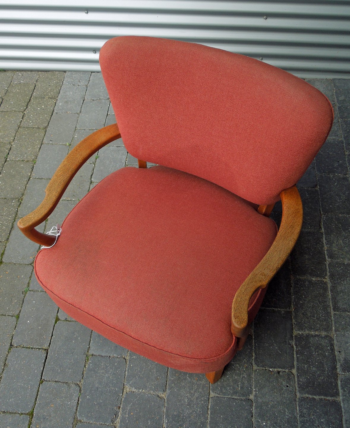 Overpolsteret lænestol. Ege stel, der er polstret "solbleget" rødt stofbetræk på ryg og sæde.
