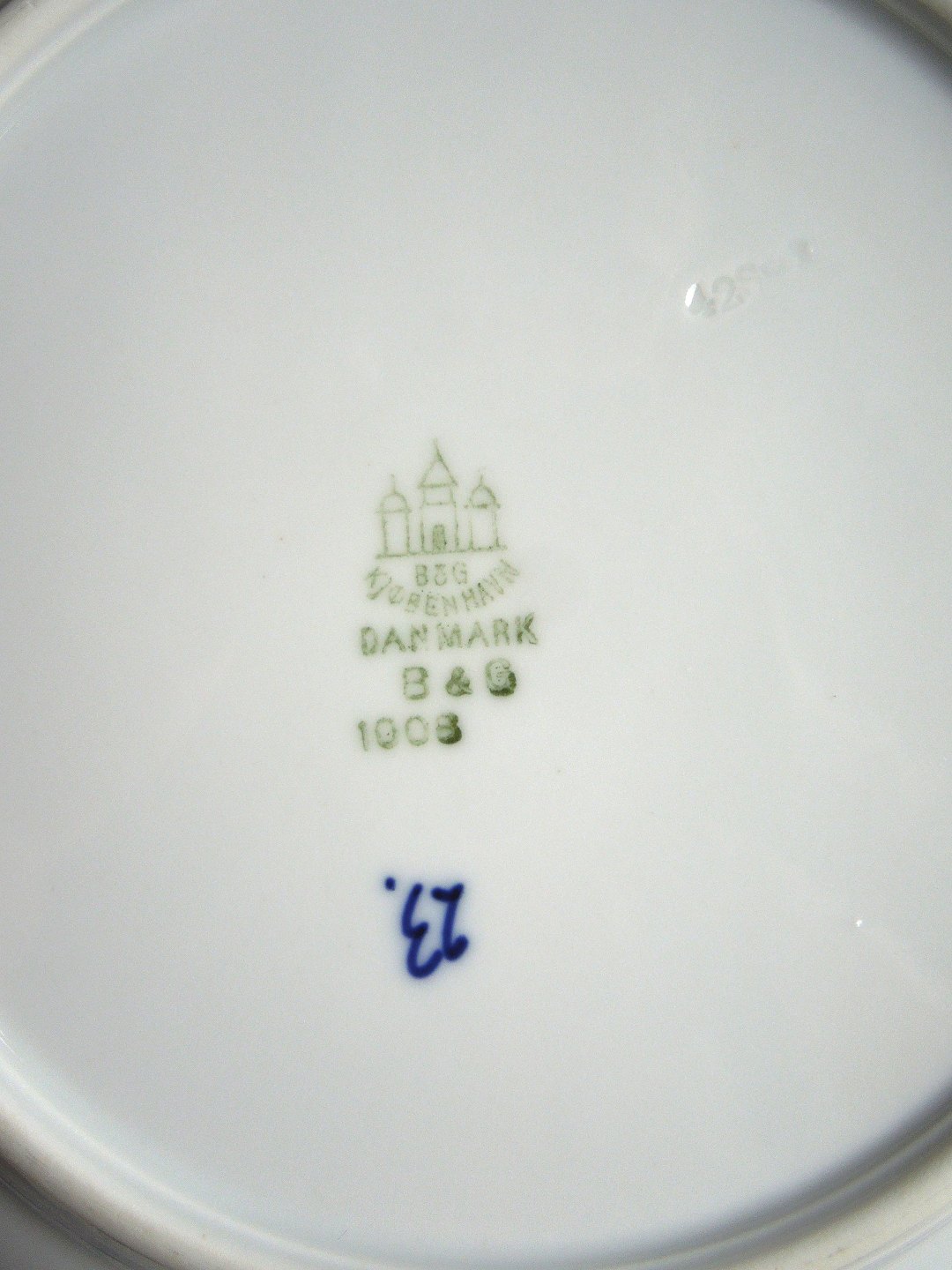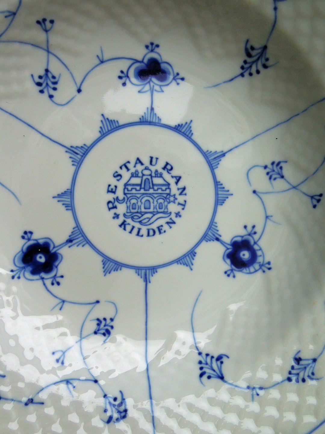 Seks Dybe tallerkner (nr. 1008) i blåmalet hotelporcelæn fra Bing og Grøndahl, Danmark. Tallerkner er fra "Restaurant Kilden" - det nuværende Hotel det hvide hus og fremstillet i kraftigt porcelæn / jernporcelæn. Lettere brugsspor kan forekomme.