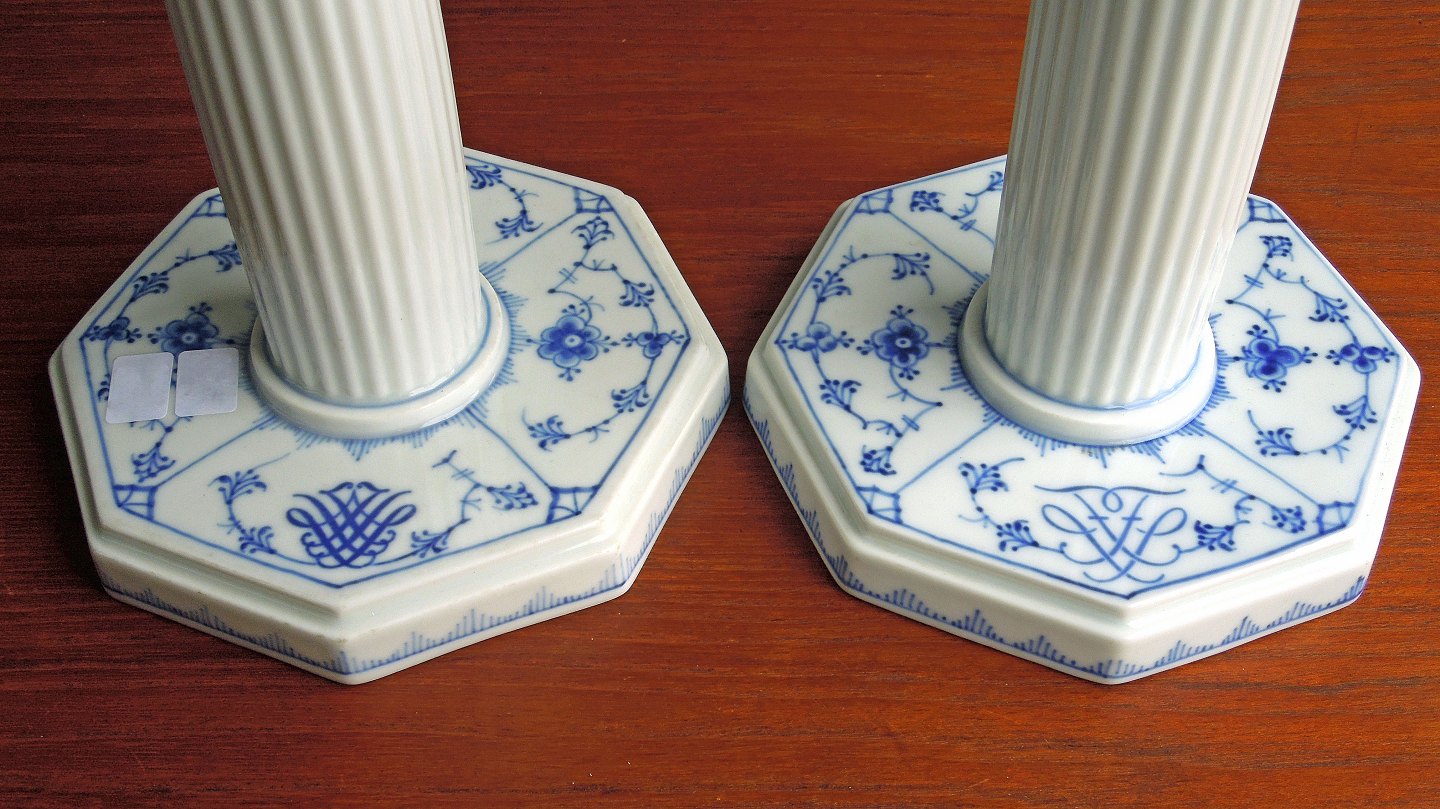 Blåmalet Kong Frederik Lysestager (nr. 1254) i hotelporcelæn fra Bing og Grøndahl. Den ene stage har en mindre reparation i lyseholderen.