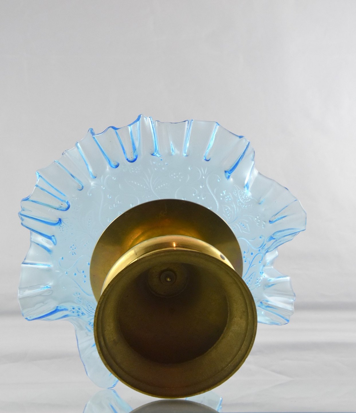 Blå gennemsigtig glasopsats med blondekant og messing fod