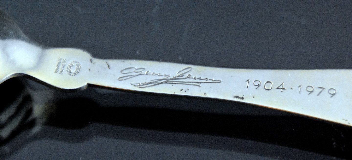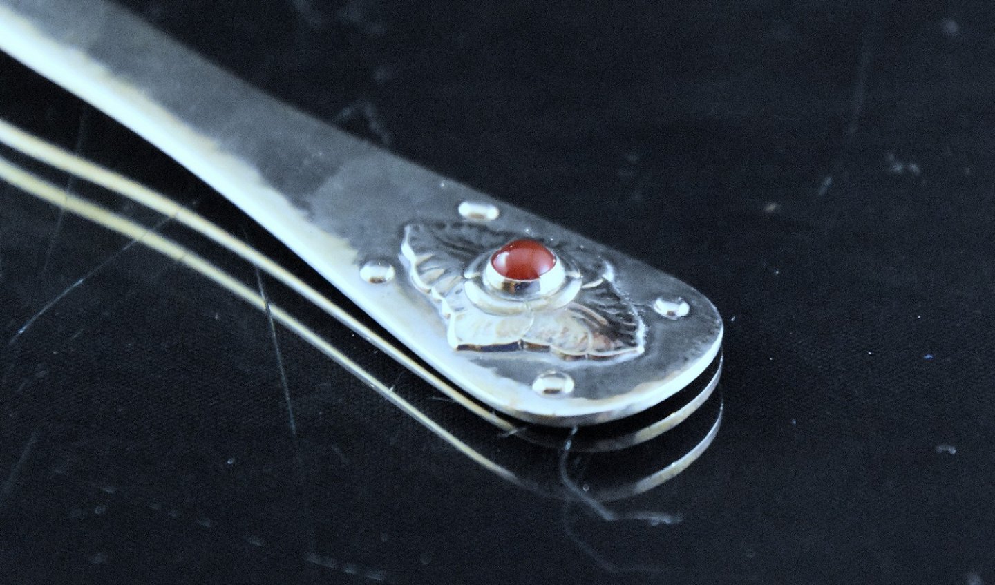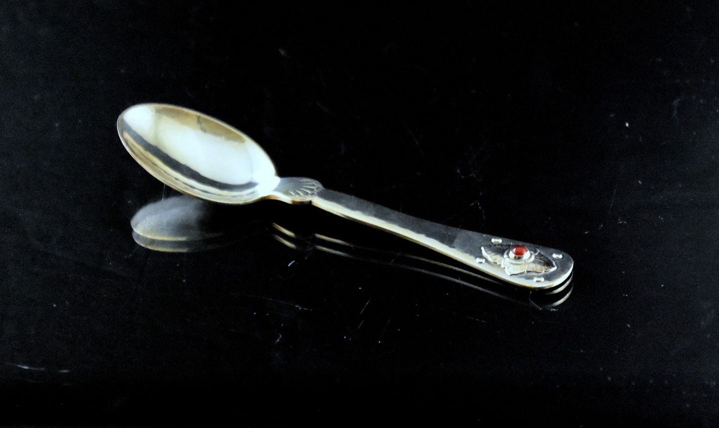 Barneske, Georg Jensen. Jubilæumsske pyntet med rød karneol. Sterlingsølv.