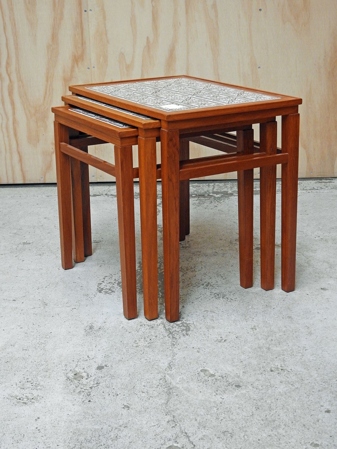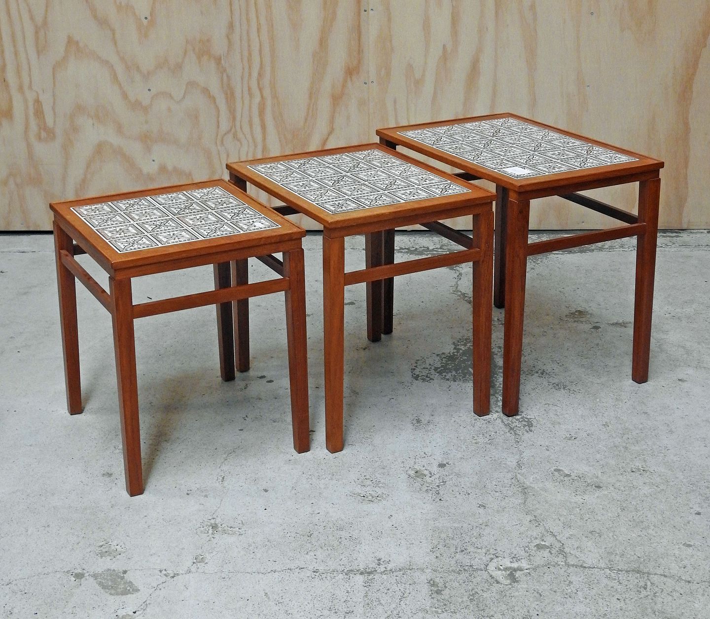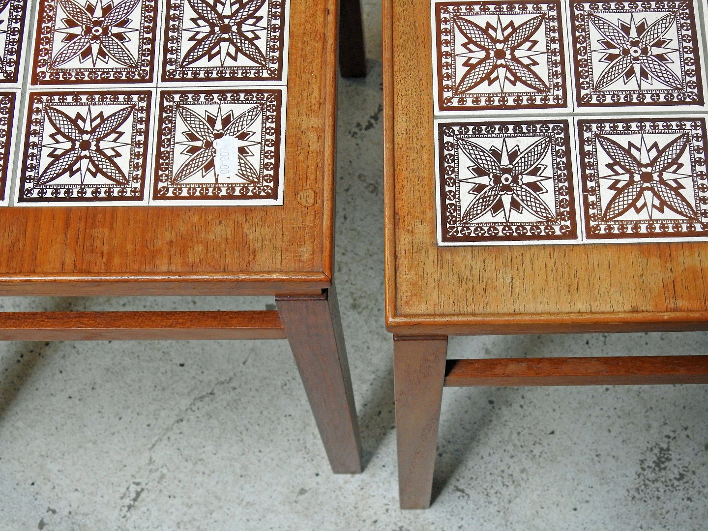 Indskudsborde i teaktræ med kakler. Dansk møbeldesign. Tre borde med mønstrede kakler i farverne hvid og brun. Brugsspor på topfladen.