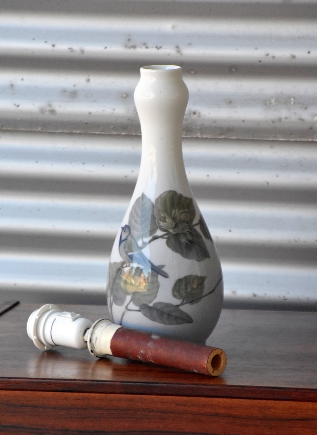 Royal Copenhagen bordlampe indsats sat i vase med motiv af fugl der sidder på gren med grønne blade (nr.: 1387/734)