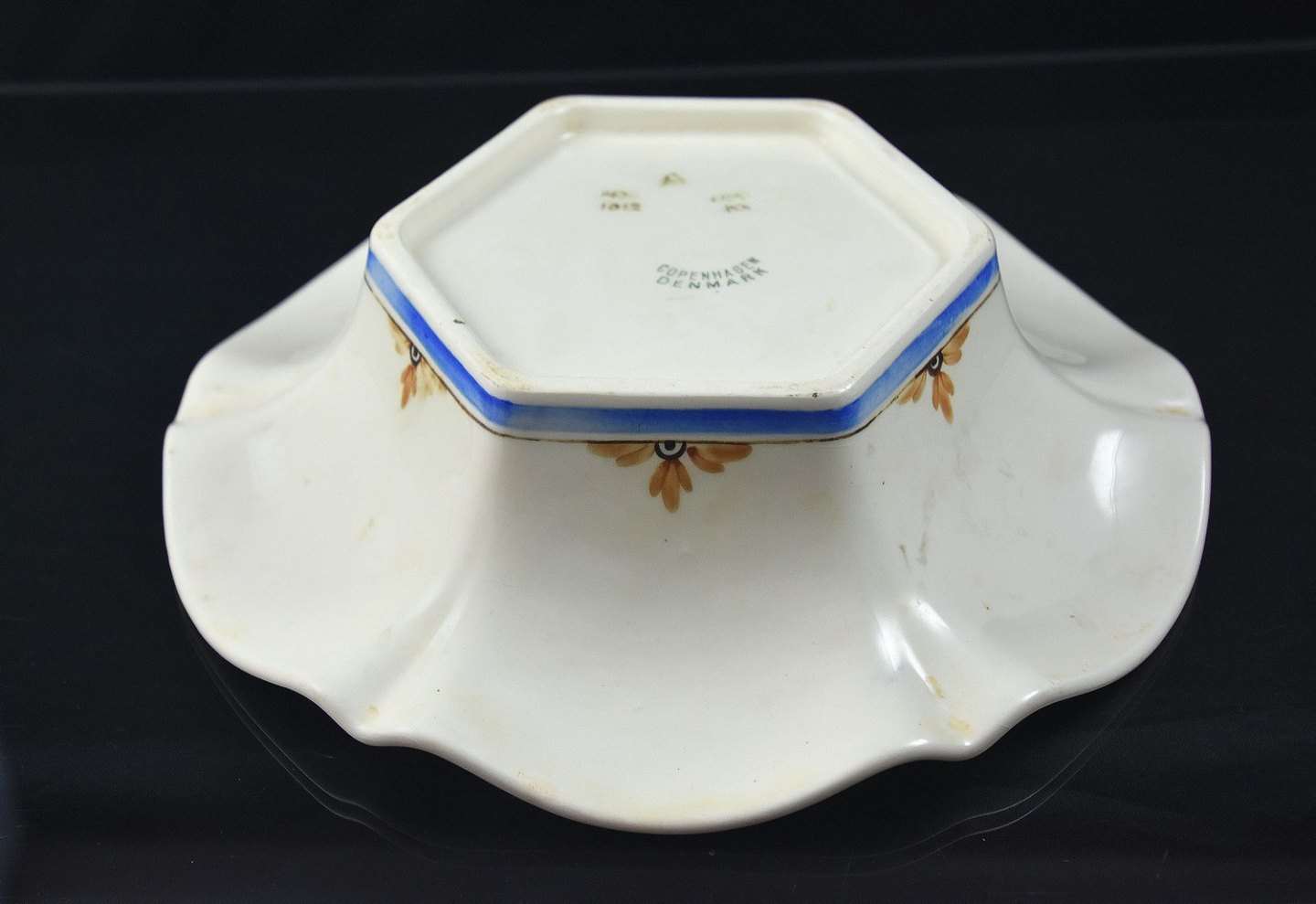 Rundt fajancefad fra Kgl./Aluminia, dekoreret med egern i bunden, der er en blå bølget kant på fadet (1436/1012) ja mystisk ligner kunstserien Efterår af Nils Thorsson, 1925-29, men kan ikke finde den på listen.