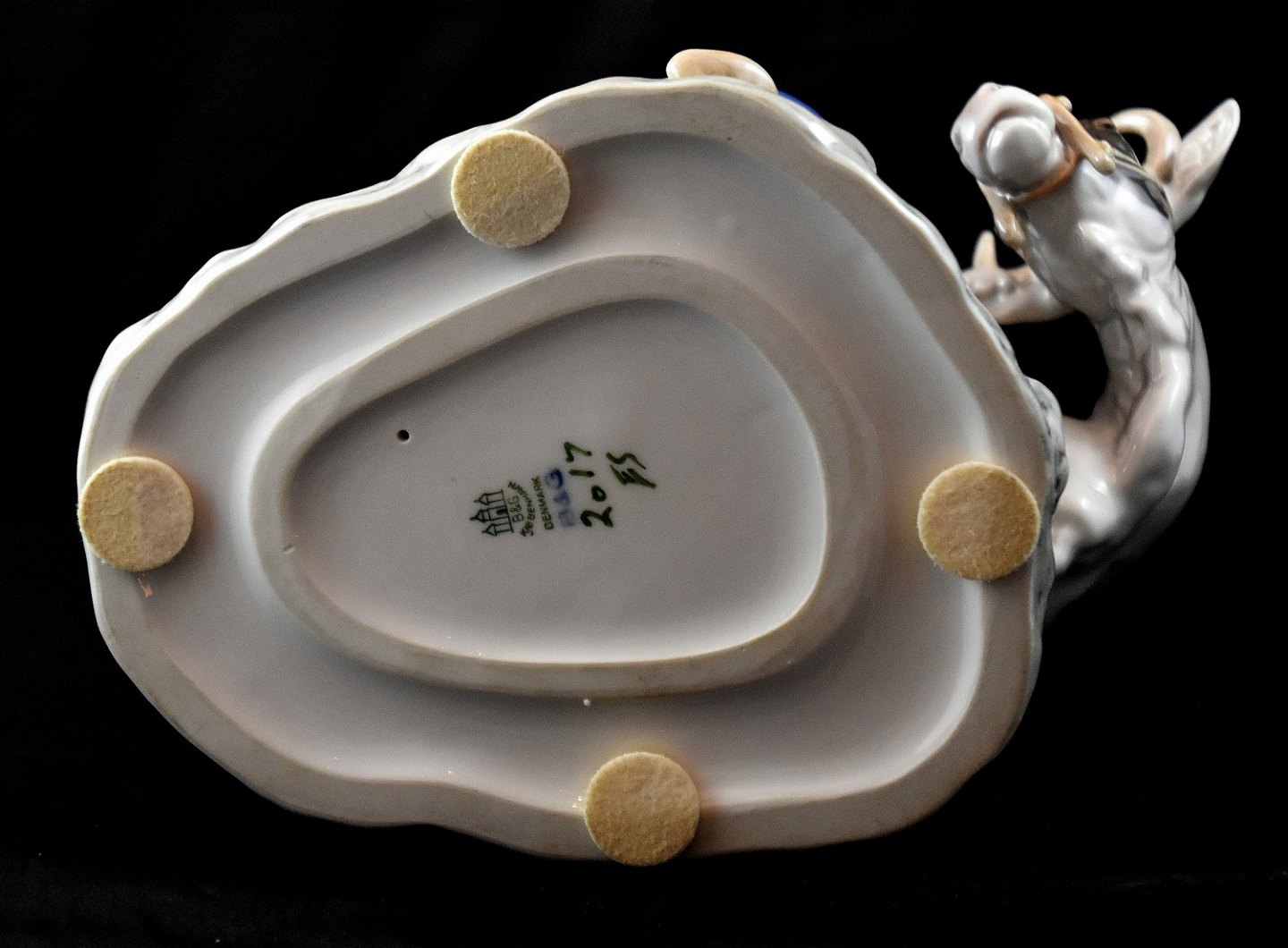 Bing & Grøndahl, Malkepige i blå kjole, der malker sortbroget ko. Lille hvid kat se på. no. 2017,