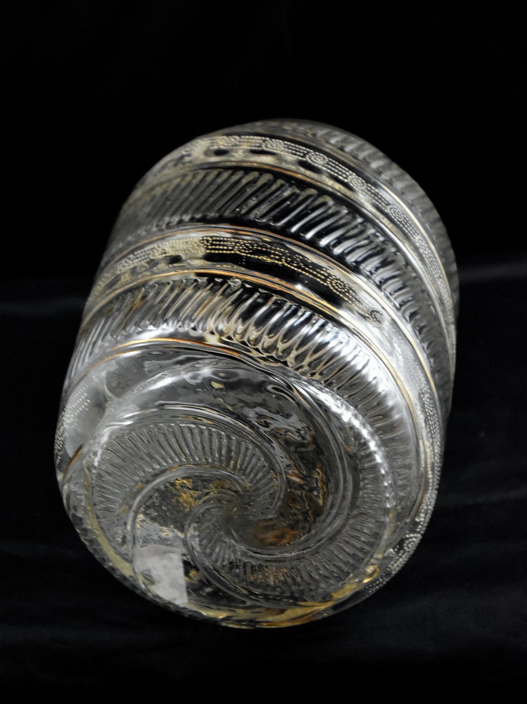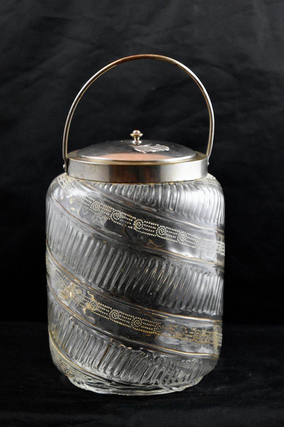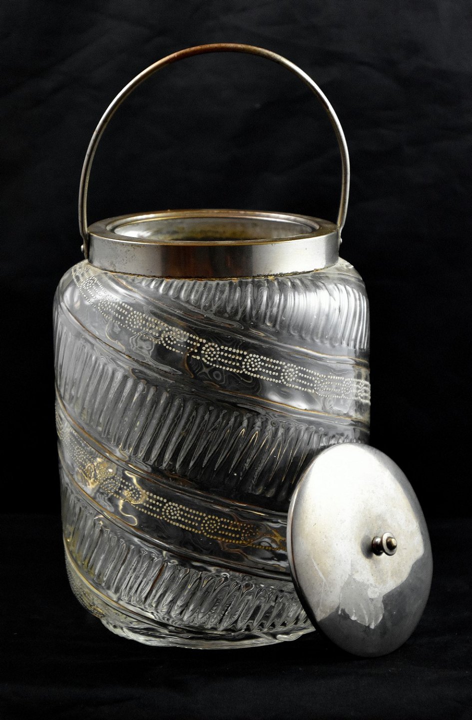 Glas kiksespand af klart glas, der er spiralmønster i glasset. Hank og låg er af metal
