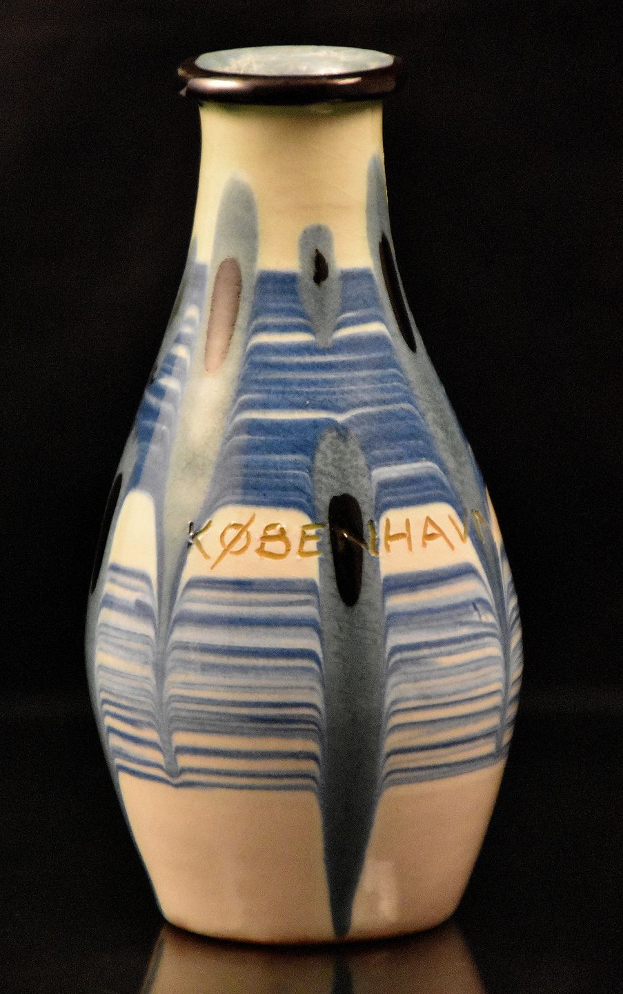 Kähler vase med blå glassur, skrevet København på siden.