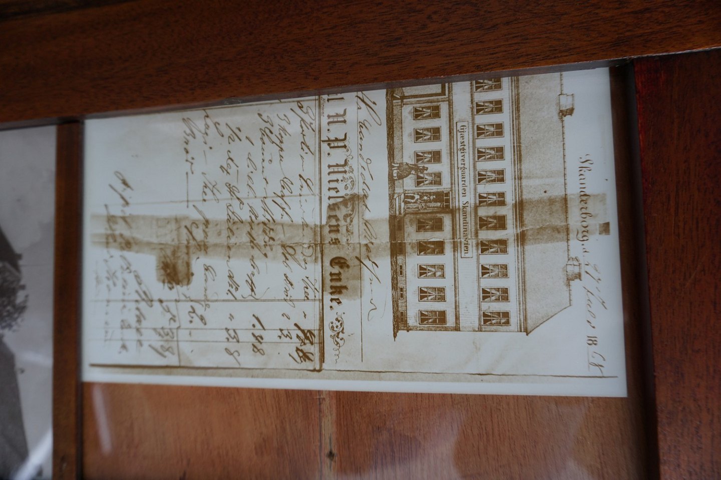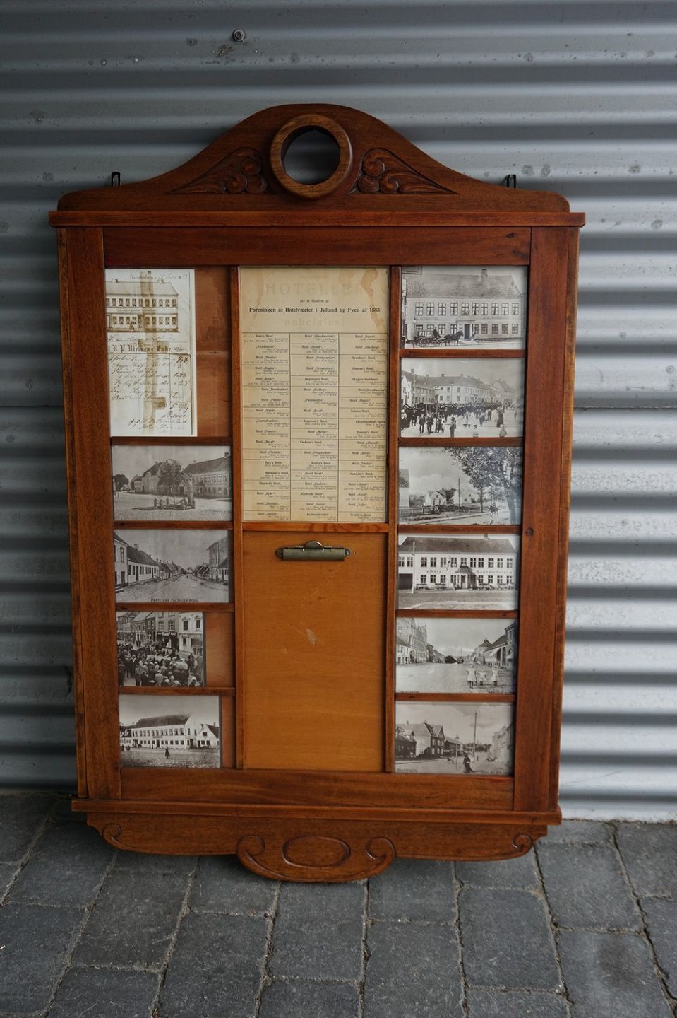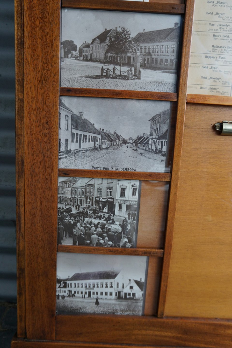 Hotelskilt med billeder og en enkelt regning. En opslagstavle for hotellet gæster Egetræ. Billederne er fra Skanderborg og hotel Skandinavien ses på en af dem.
