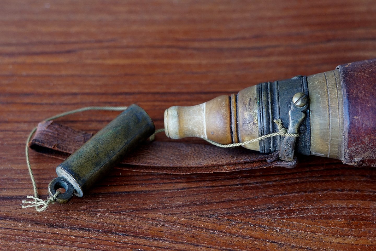 Krudthorn, i læder med messing top. Krudthornet er til jægeren når han på jagten skal genlade.