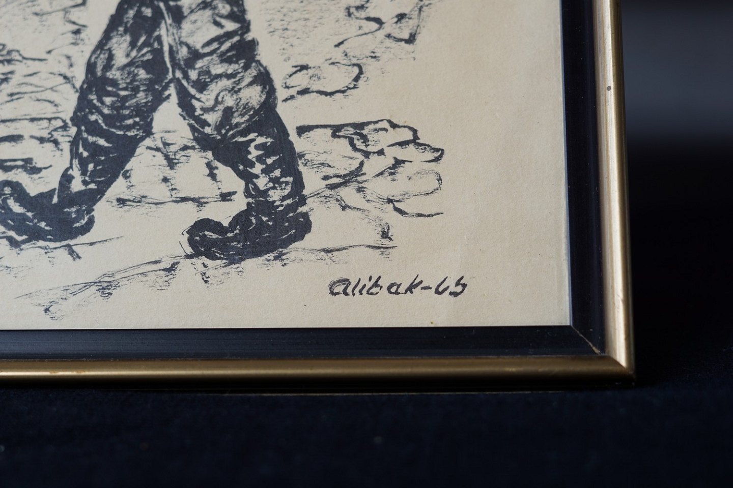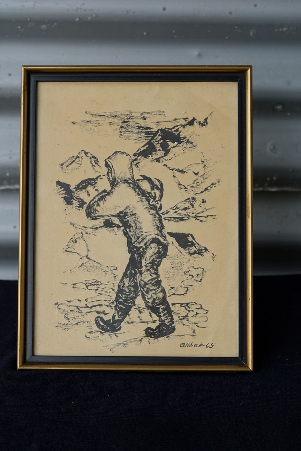 Indrammmet tryk i gylden ramme med motiv af eskimo i dragt på Grønland