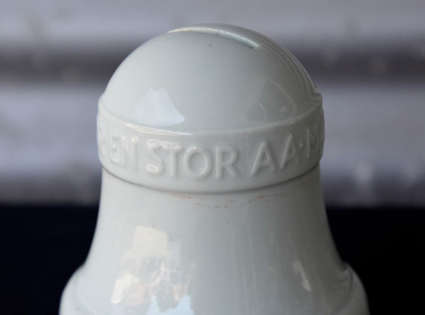 Gammel sparebøsse i mintgrøn porcelæn i form af en klokke