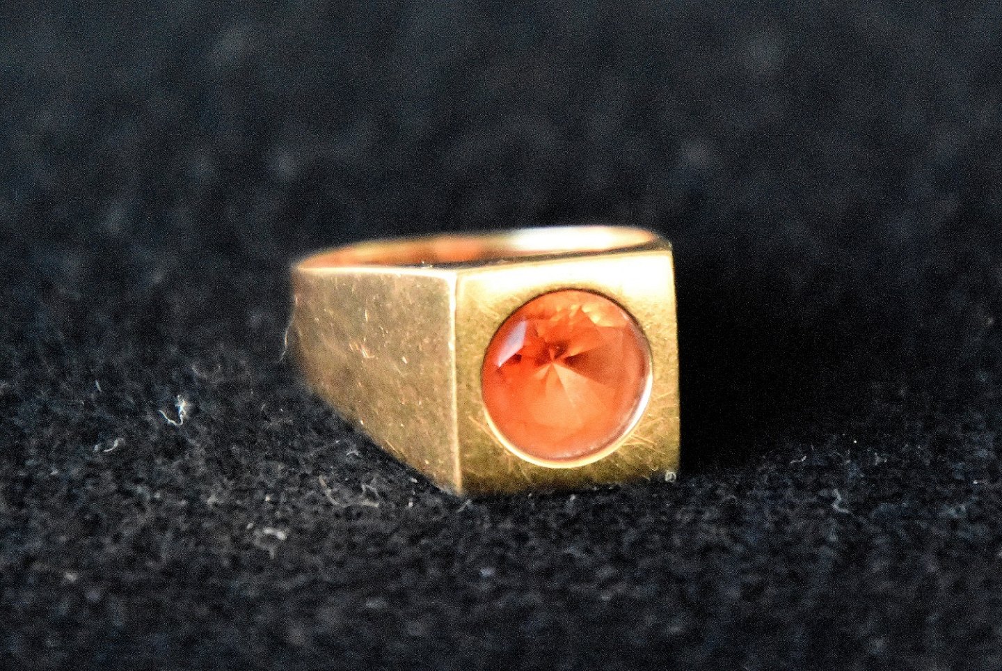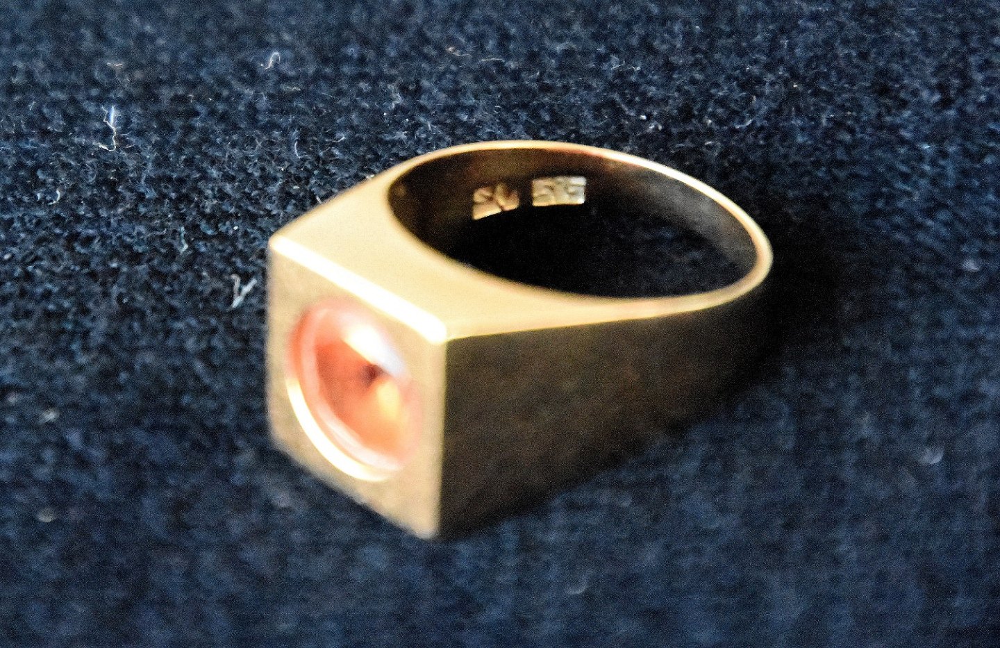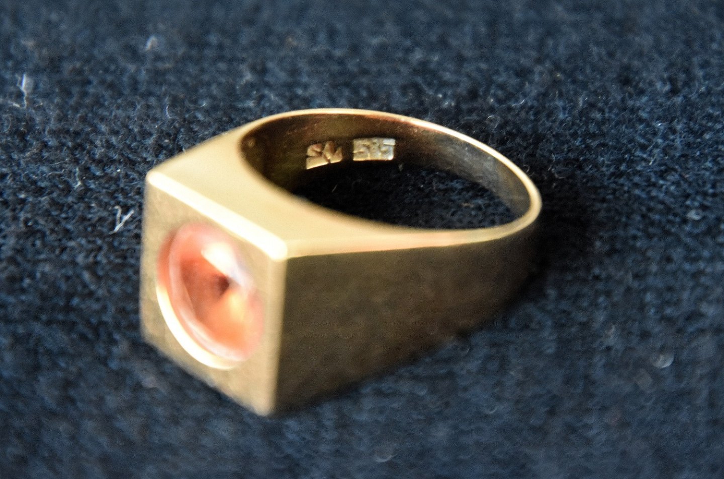 Ringen har en 4-kantet forside, med en klar ravfarvet sten