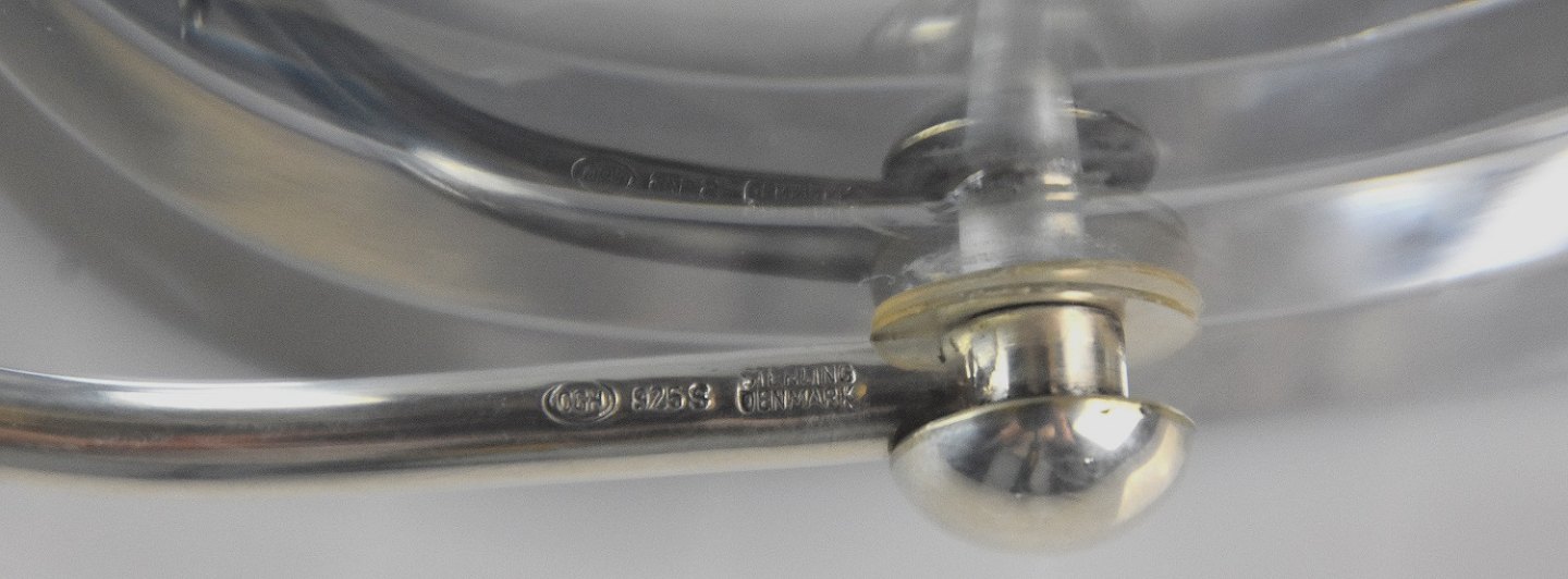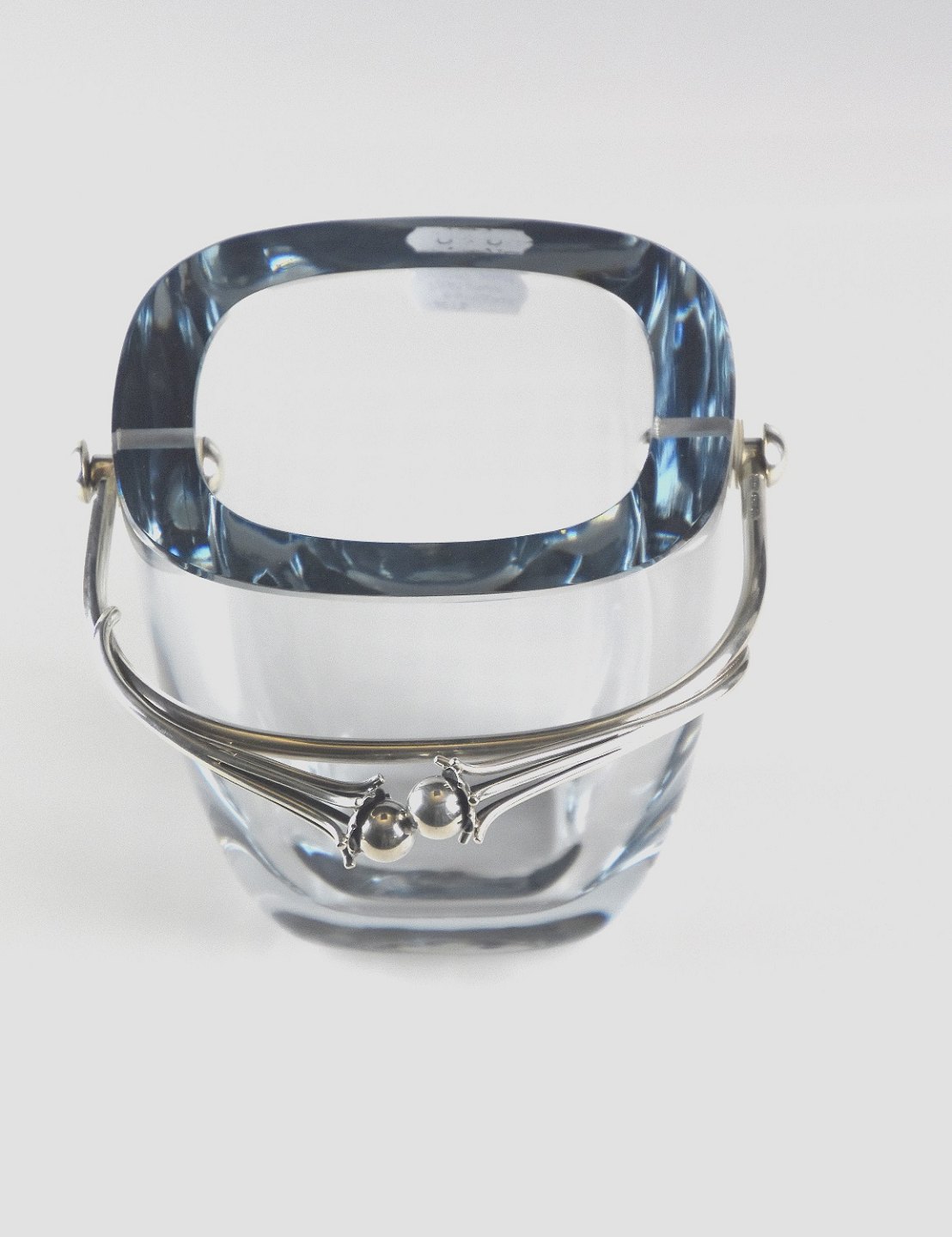 Holmegaard Isspand med sølv hank (sterling sølv), selve glasset er tykt og blåligt. Hanken fremstillet af Dansk Guldsmed Håndværk