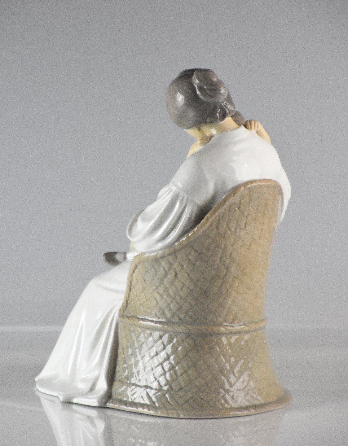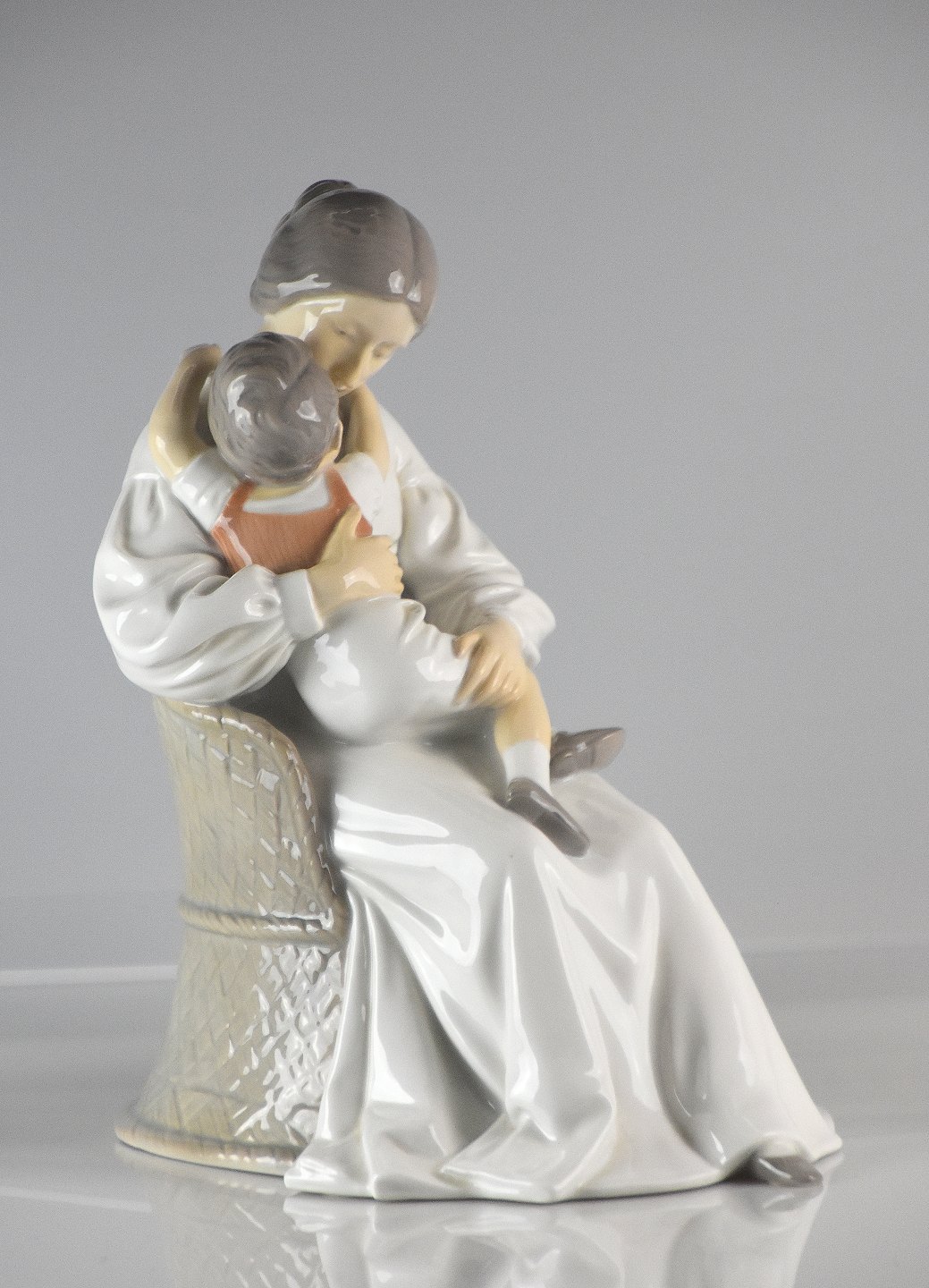 Figur i porcelæn med motiv af mor og barn i kurvestol. Nr. 1552