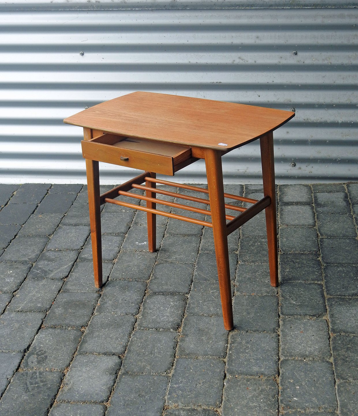 Entremøbel med teak plade og lakeret bøg med skuffe og hylde