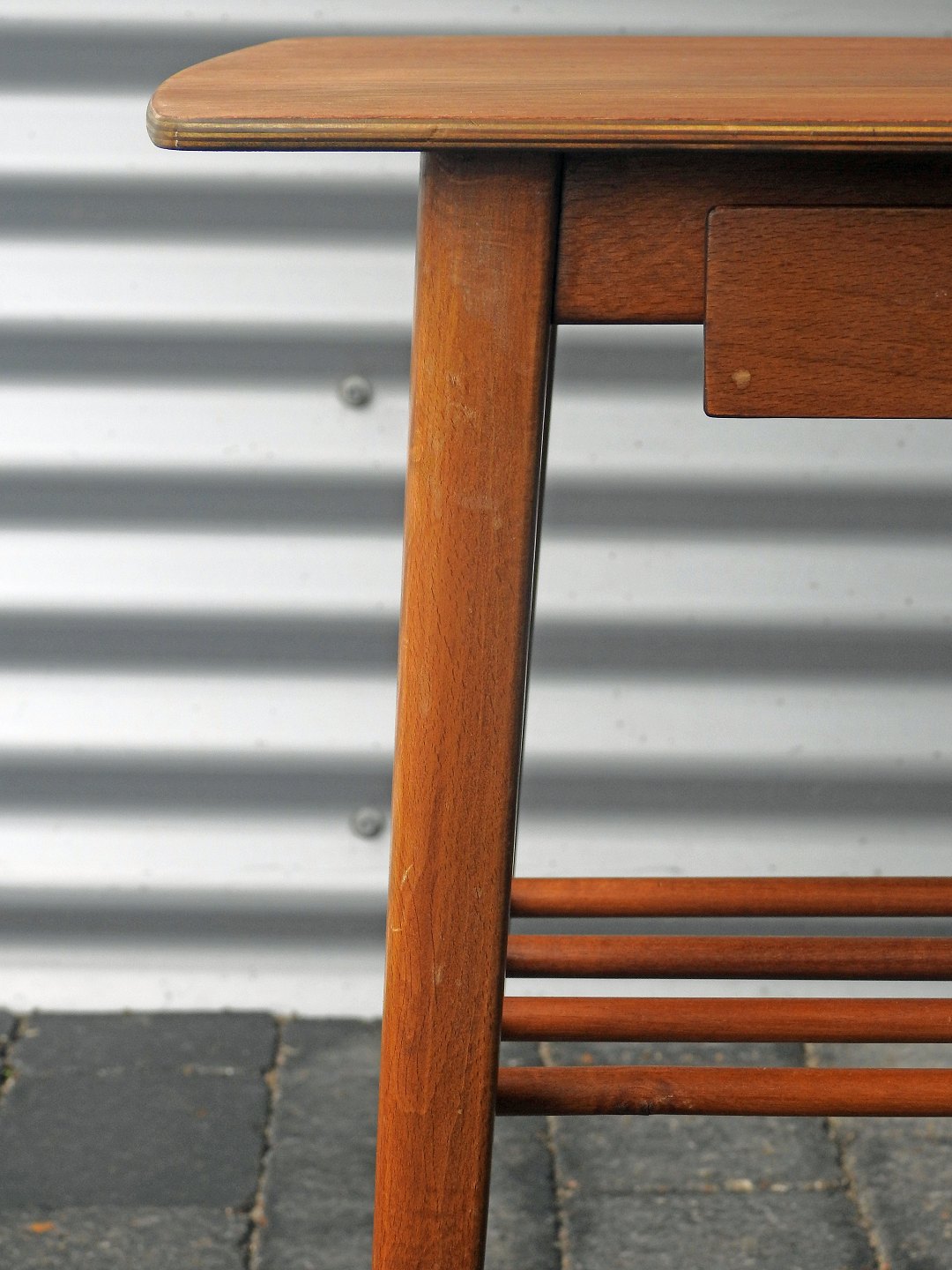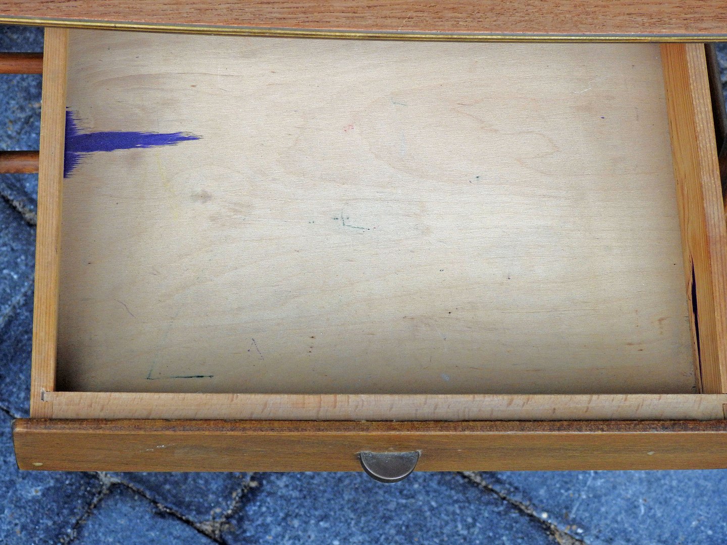 Brugsspor - tuschmærker i skuffen og nøk i lak/træ på forsiden.